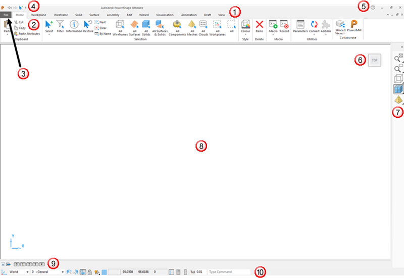 PowerShape uses a Windows-style interface consisting of a ribbon with tabs. The areas of the screen are identified as follows:
