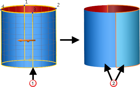 Note: If you select a curve (other than curve number 1) on a surface that is closed in the other direction, then two surfaces are created. One surface is from curve 1 to the selected curve and the other is from the selected curve to the original closure. In the following example, we break the surface at curve 3to give two surfaces