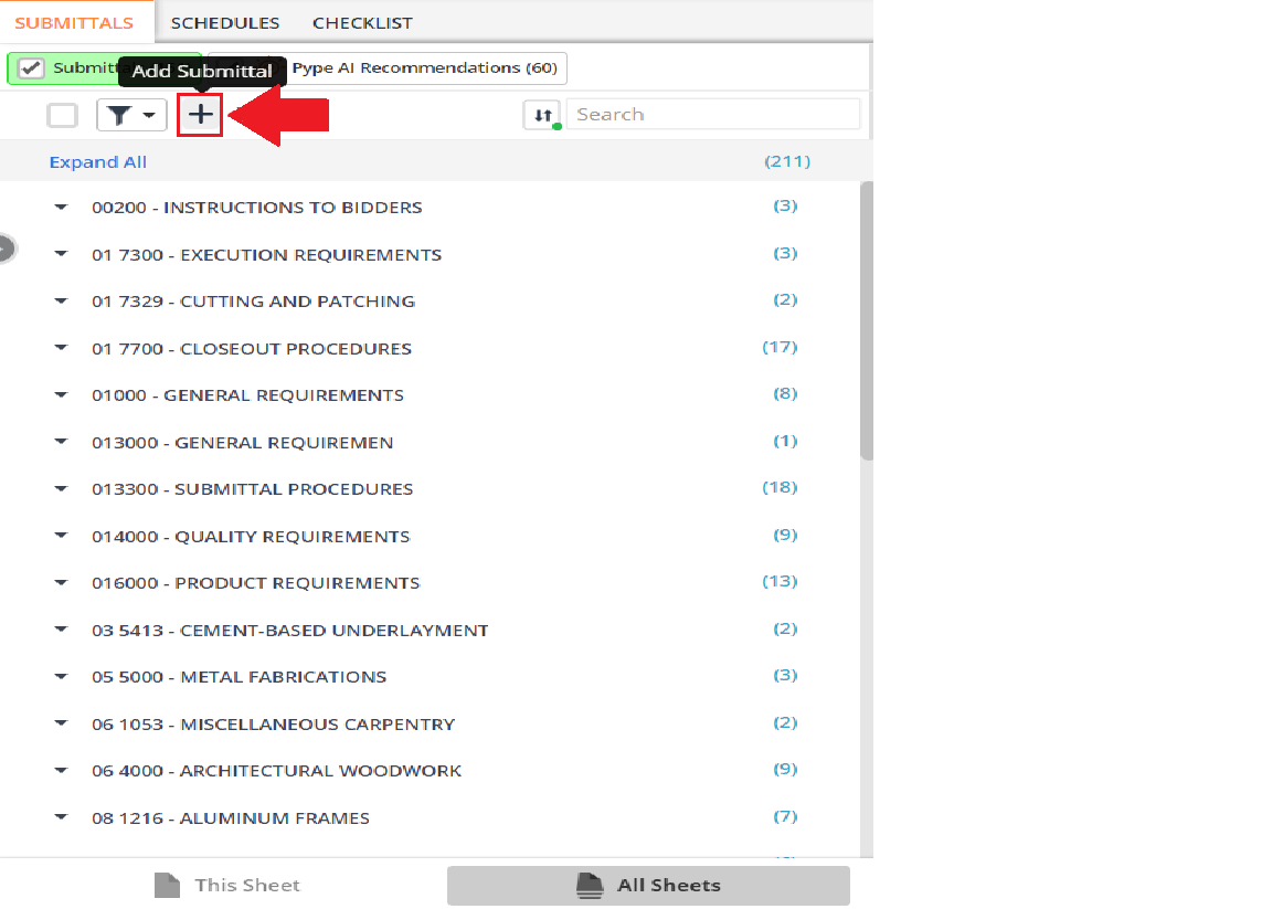 If you would like to manually add a submittal to the log for the project, click the add button highlighted below.