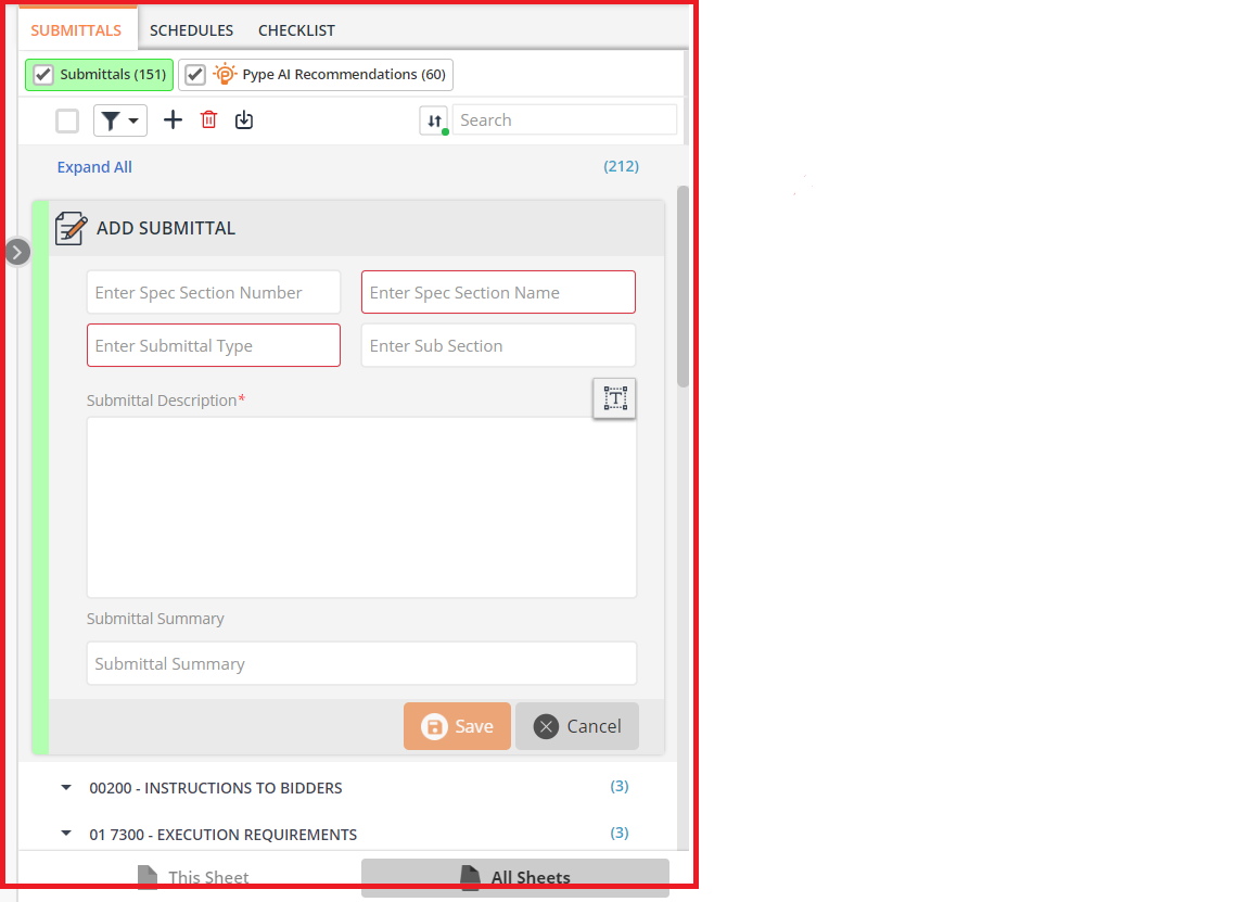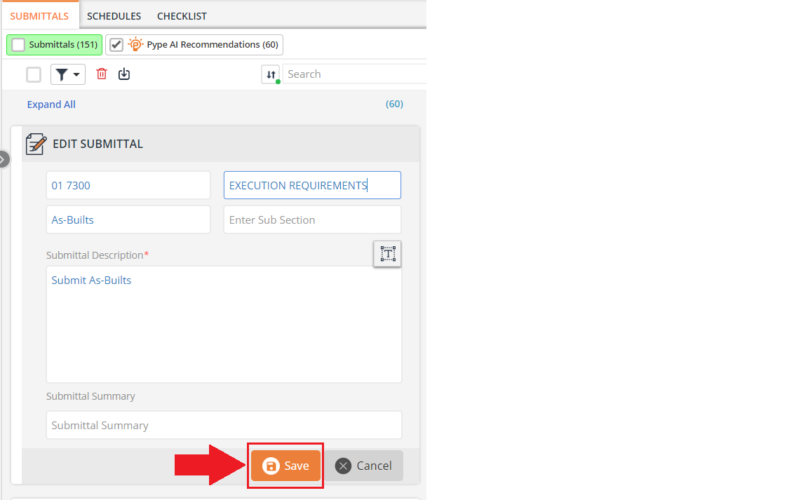 After editing the information in the available fields (Spec Name/Title, Spec Section, Sub Section, Submittal Type, Submittal Summary, & Submittal Description), make sure to click the "Save" button.