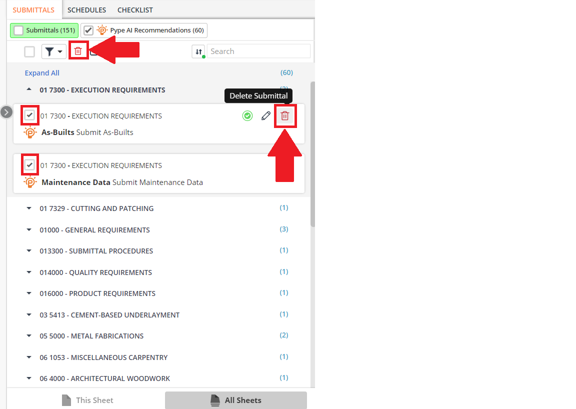 To delete a submittal, click on the red trashcan button highlighted in the screenshot below.