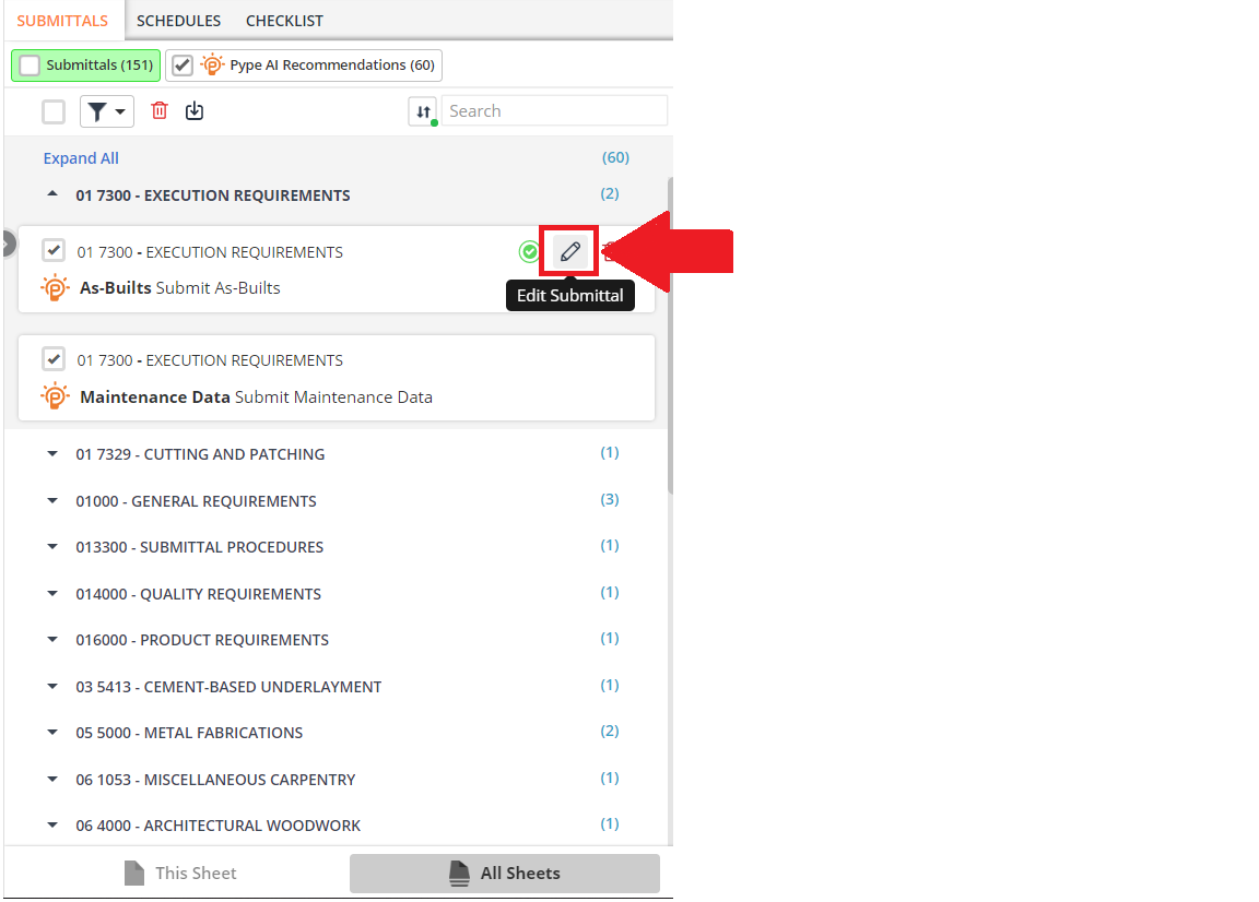 If you would like to edit a submittal, click on the pencil-shaped button on the submittal that requires editing.
