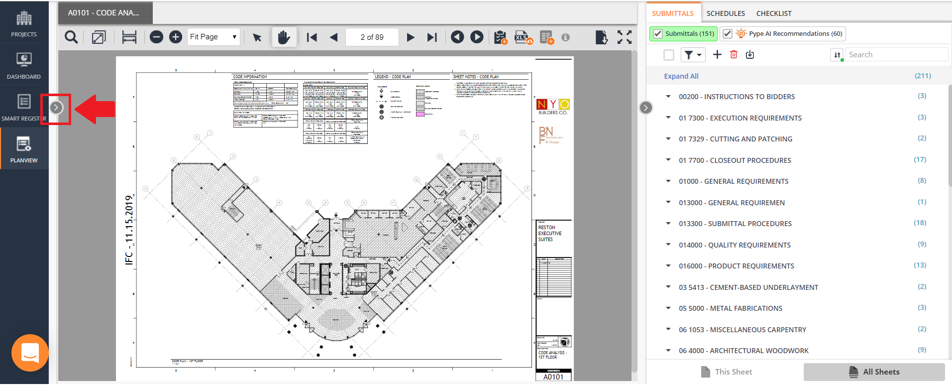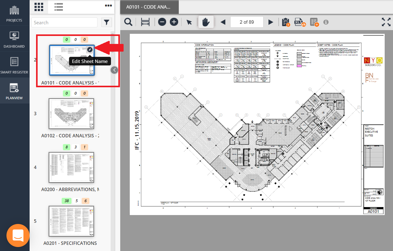 Within PlanView you are able to edit the sheet name and sheet numbers that the platform assigns to each drawing sheet. To do this, the first step is to expand the sheet viewer on the left-hand side of PlanView.