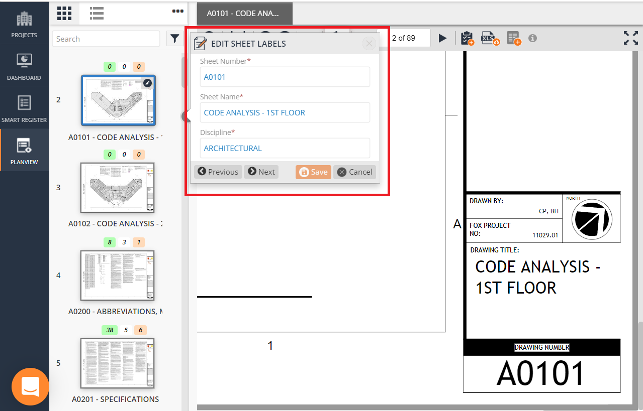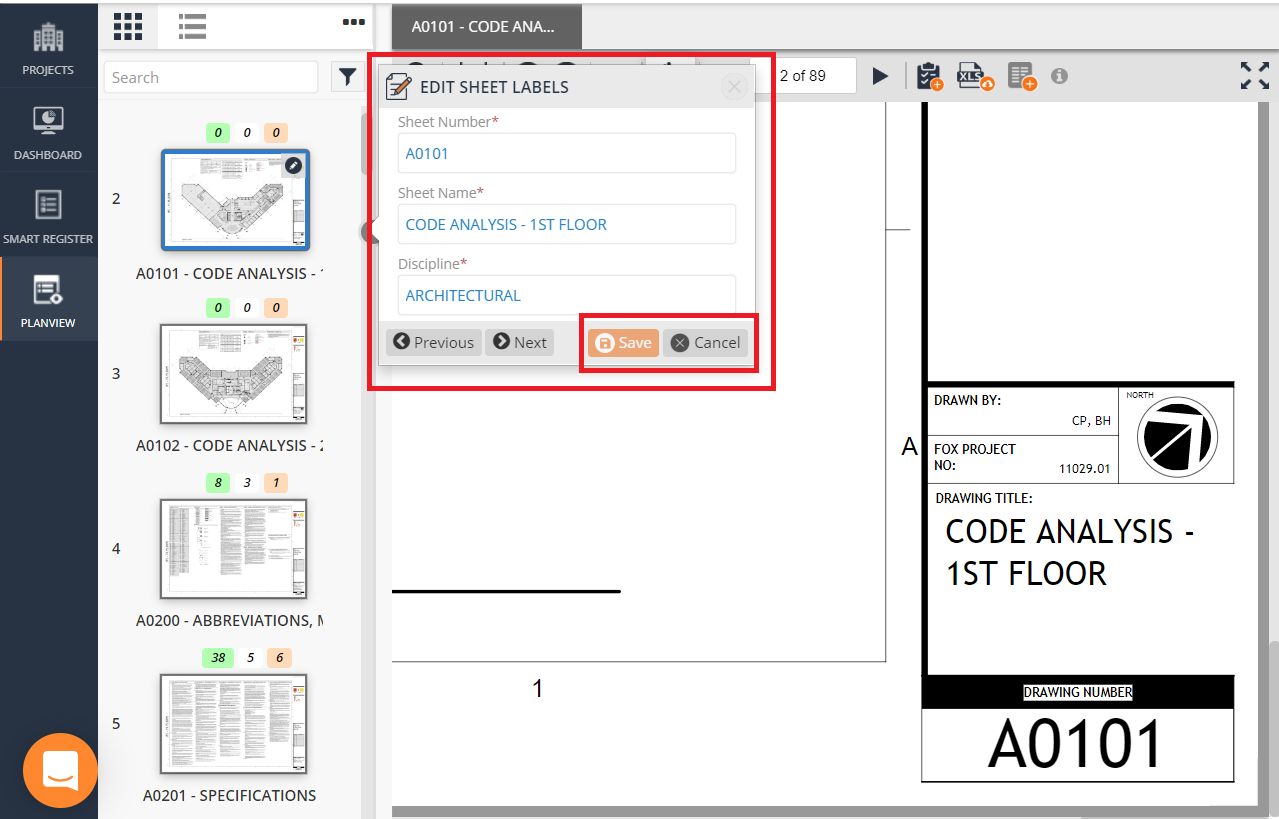 After clicking the pencil icon, the sheet name and number editor will appear. In here you can update both the sheet name and number for the selected sheet.