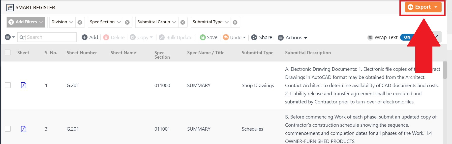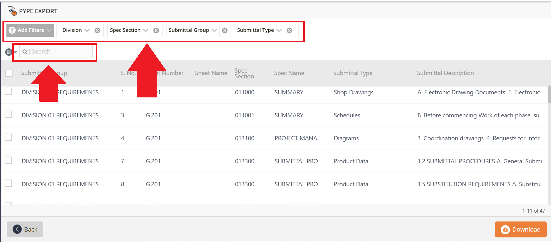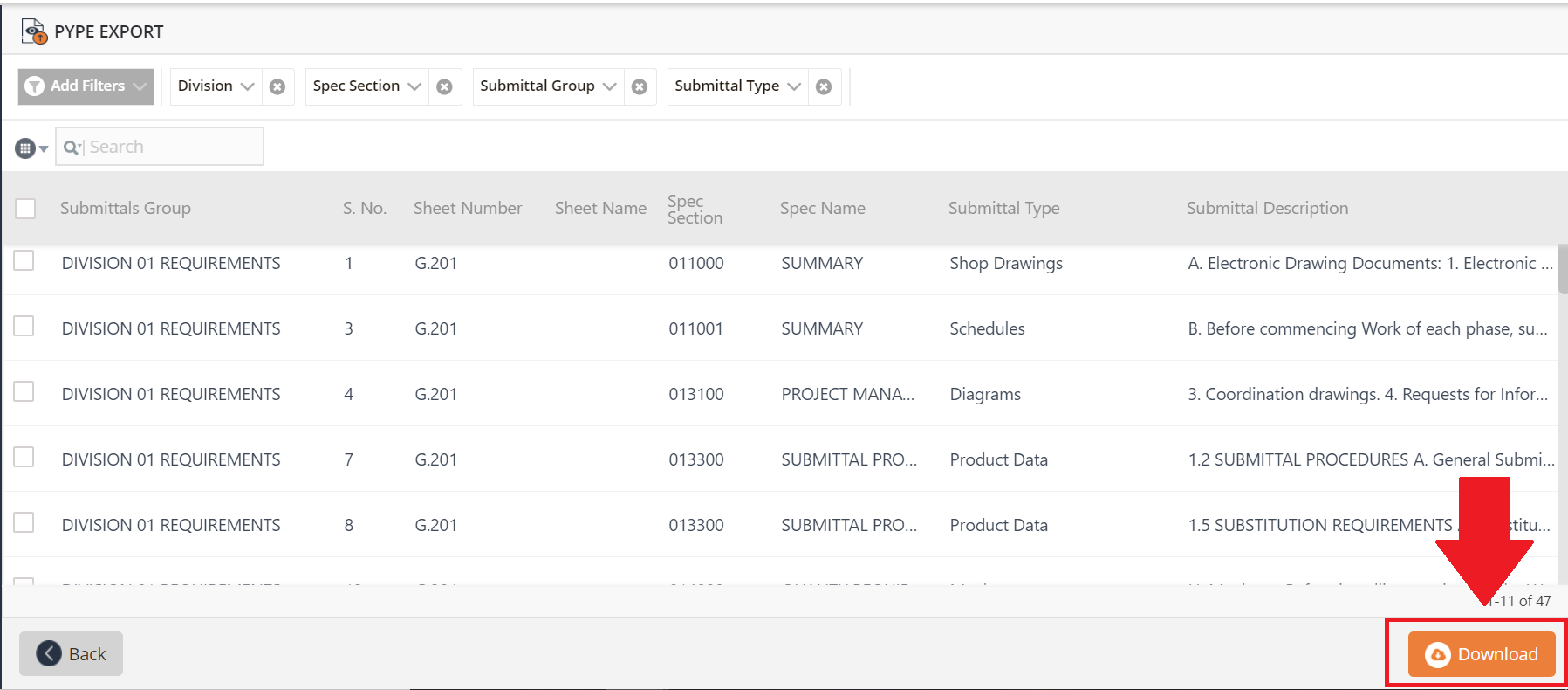 Step 3: On the next screen, you can confirm the submittals you would like to export. You will have the option to filter by Submittal Group, Division, Spec Section, Group, or Submittal Type. You can also search through submittals and only export a selected few if needed.