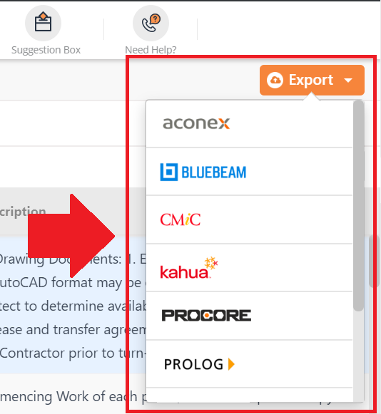 Step 2: A drop-down menu will appear, which will show the export types that have been setup for your company. Keep in mind that you most likely not see all of the options shown in the screenshot below. You will only see the project management software(s) that your company is currently using. If you do not see the export type required for your project, please let us know and we'll work on getting it setup for you.