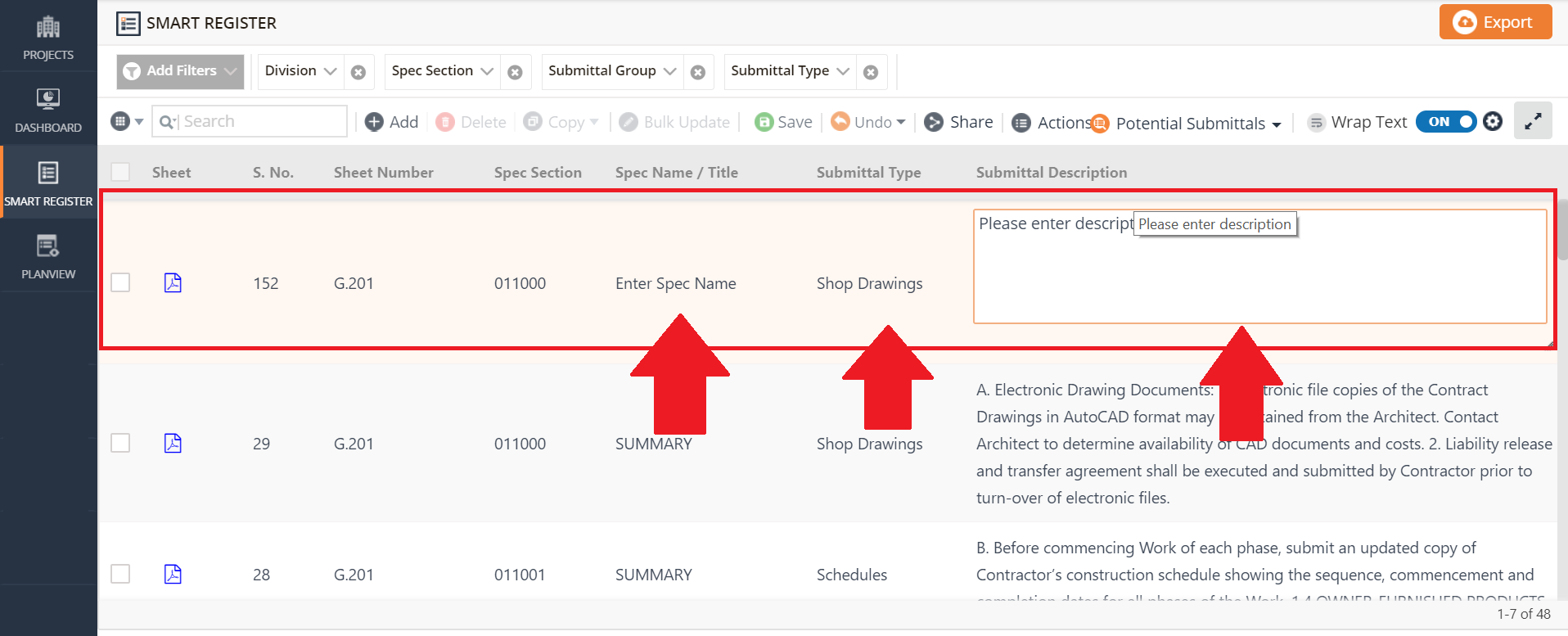 The SmartPlans platform allows to add or delete submittals requirements found within an uploaded drawing set. This is typically carried out when project teams are editing the submittal log before a final export. To do this, please follow the directions laid out below.