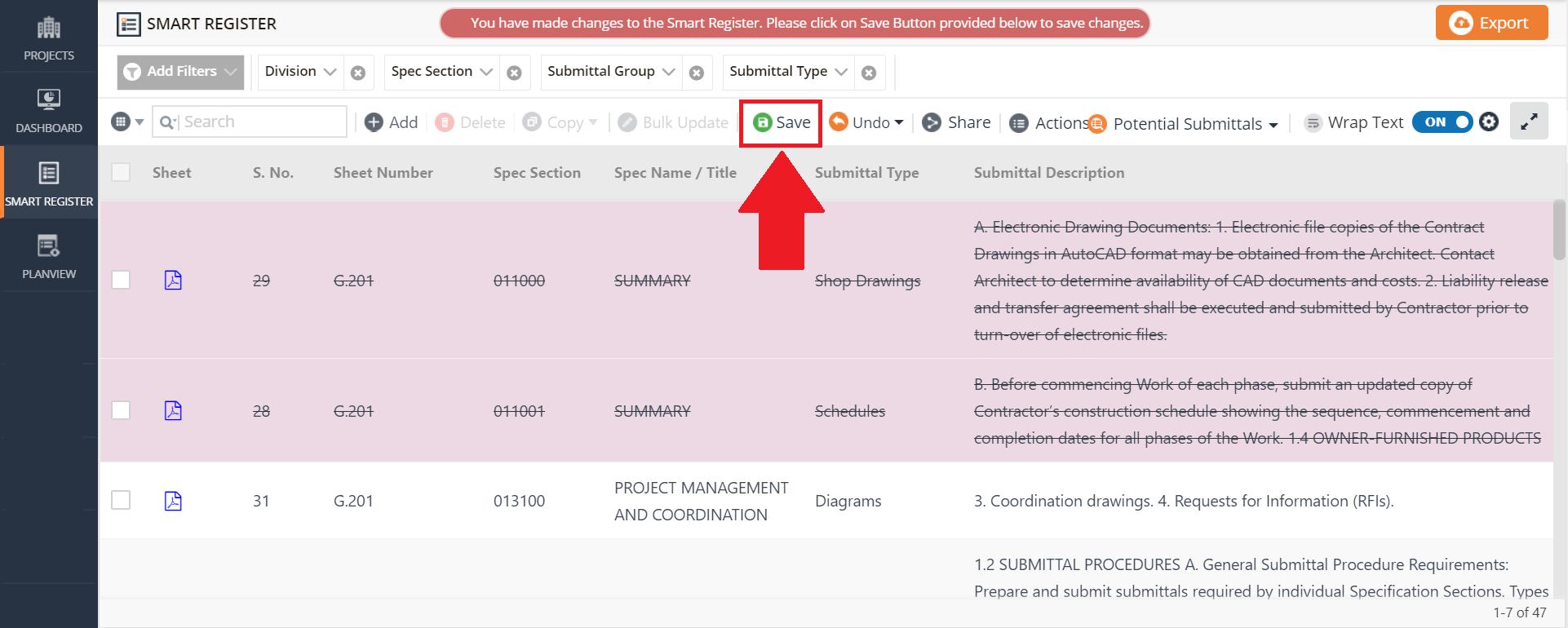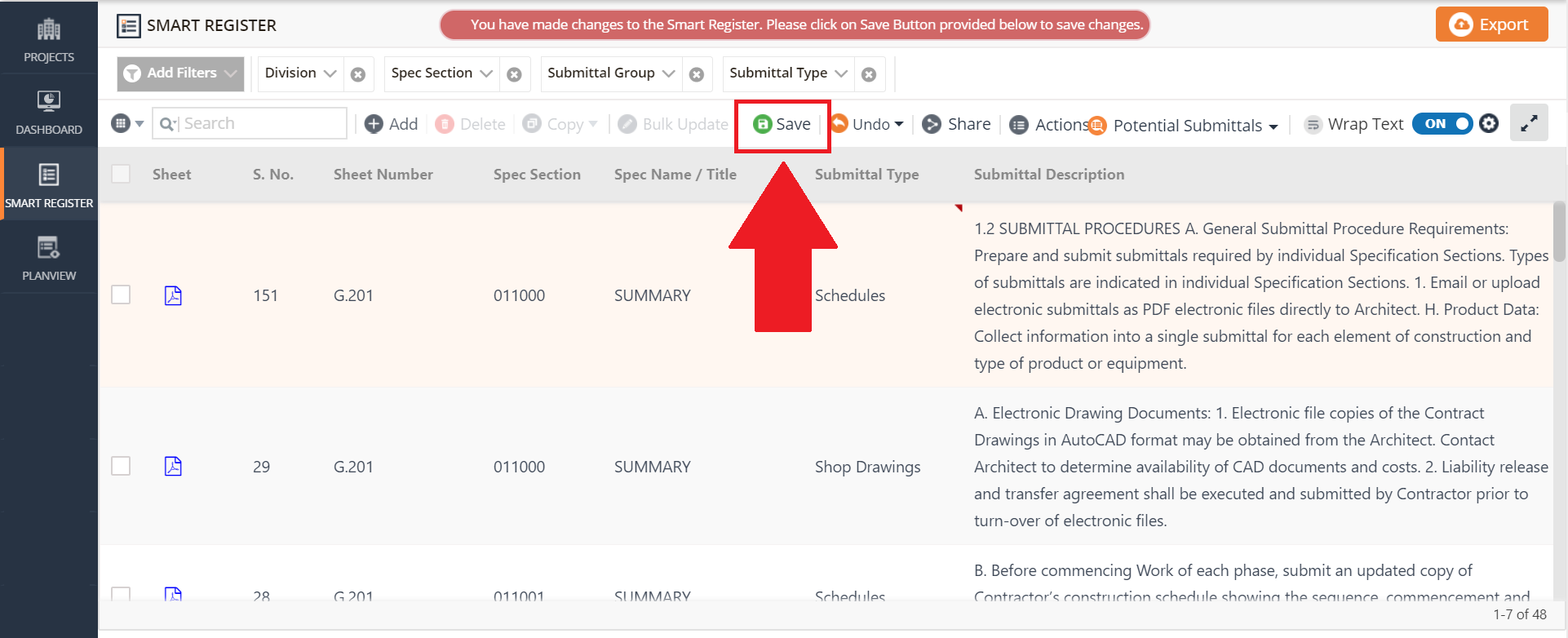 Step 3: After adding the required submittal information, the last step in adding a submittal is to click the "Save" button. If you do not click the "Save" button and navigate away from the Smart Register, the newly created submittals will not be saved.
