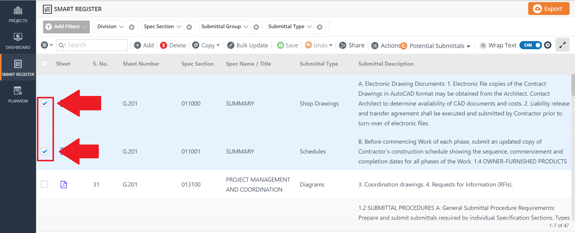 Step 1: In order to delete a submittal record from the Smart Register, select the check box next to submittal or sumbittals that you would like to delete.