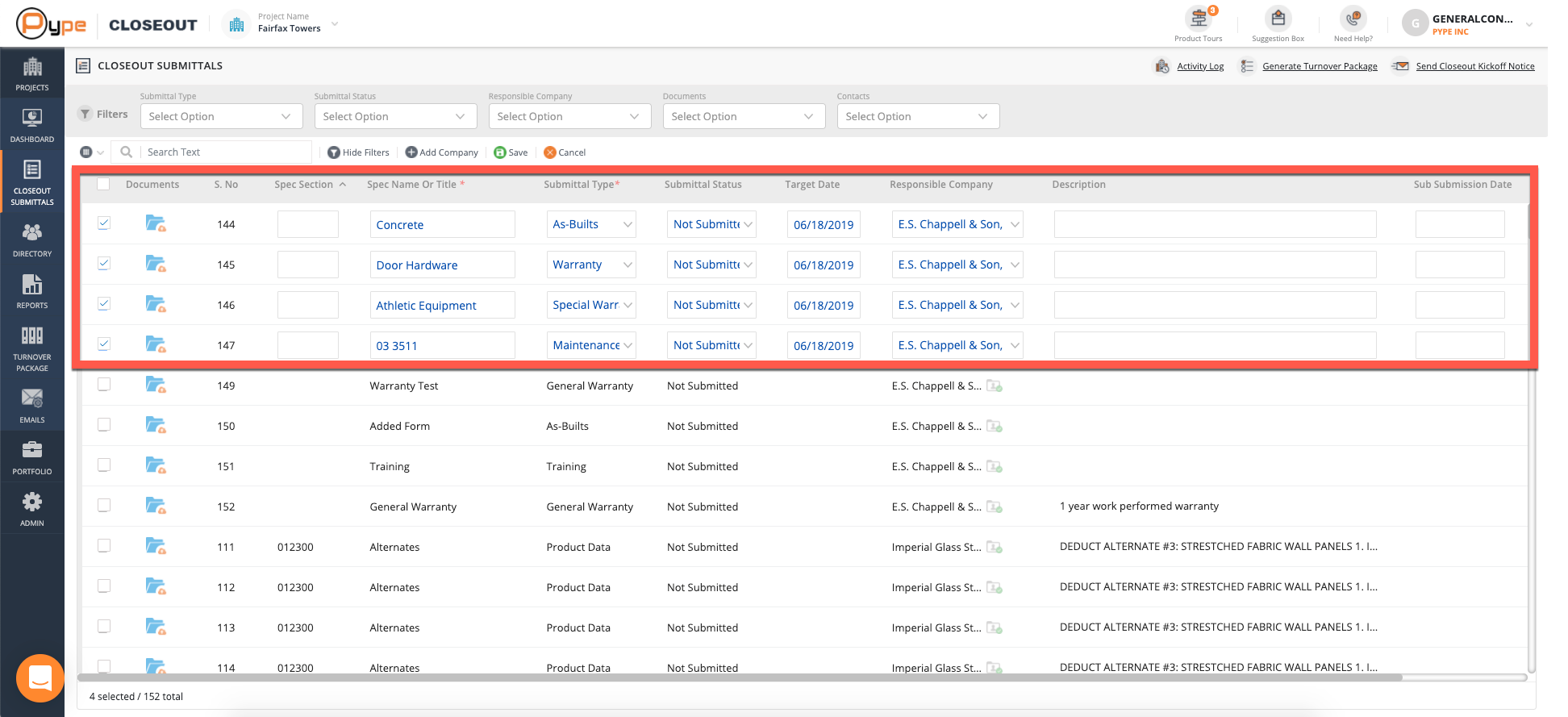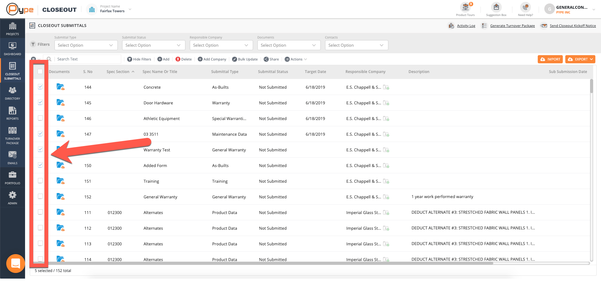 You will see all of the submittals for your project based on your current filters. Choose as many submittals as needed to bulk edit by checking the checkboxes to the left of the corresponding submittals.