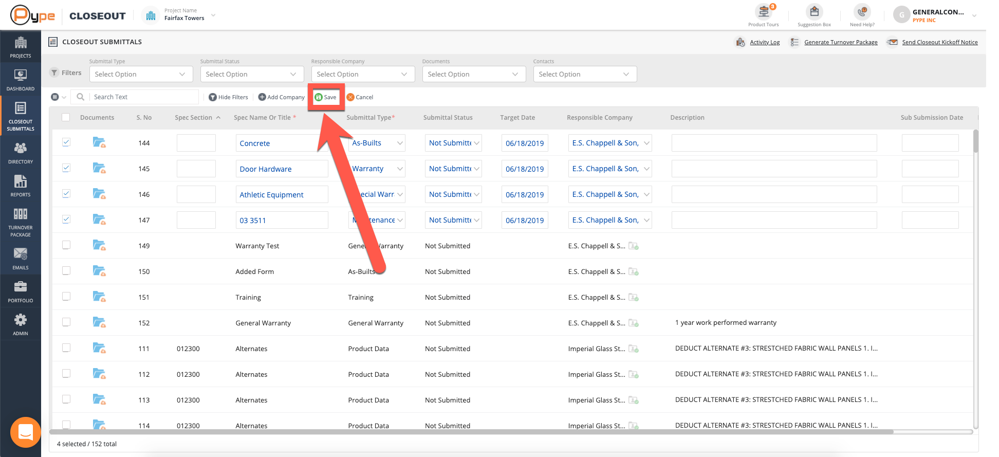 Once you are in the desired Project, click on the Closeout Submittals button on the left-hand side of the page.