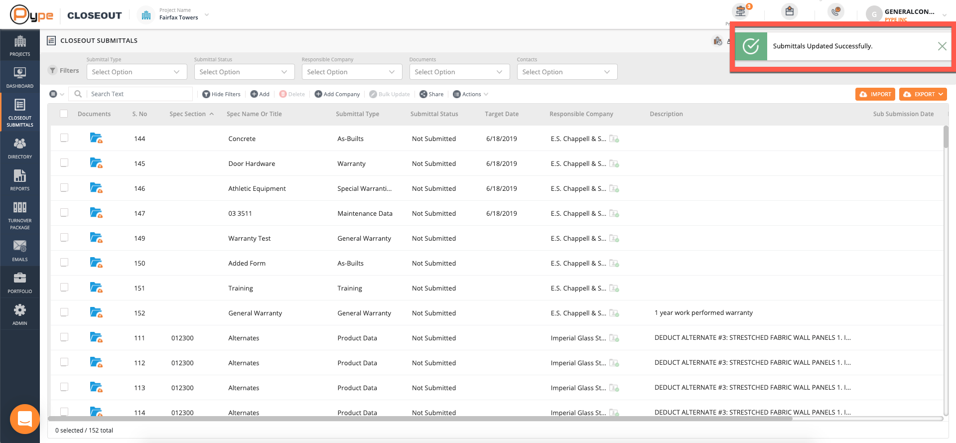 If you have updated your submittals successfully, you will be shown a message in the top right-hand corner of your screen that says Submittals Updated Successfully.