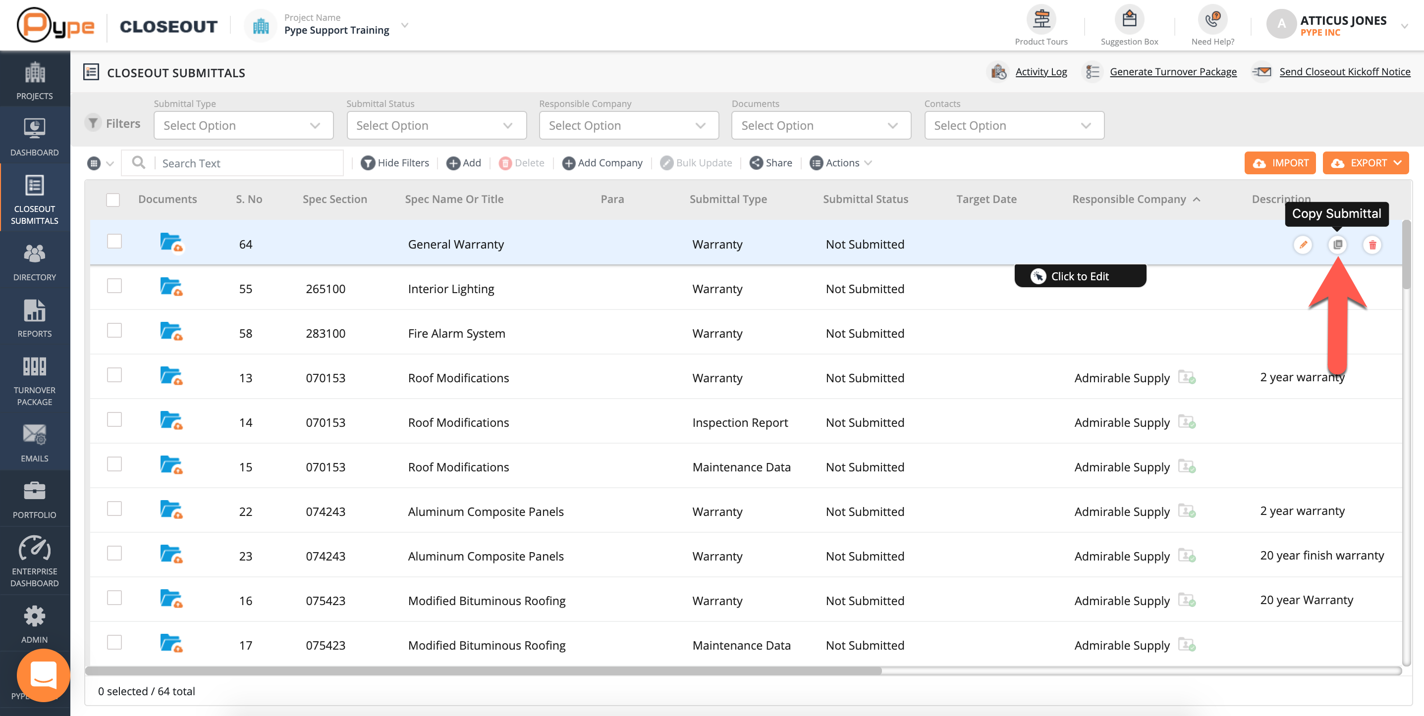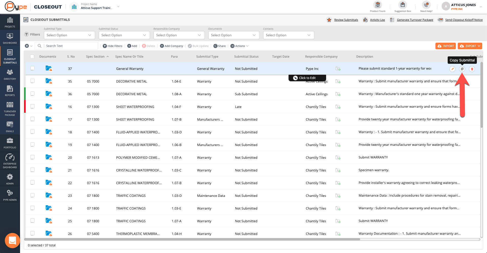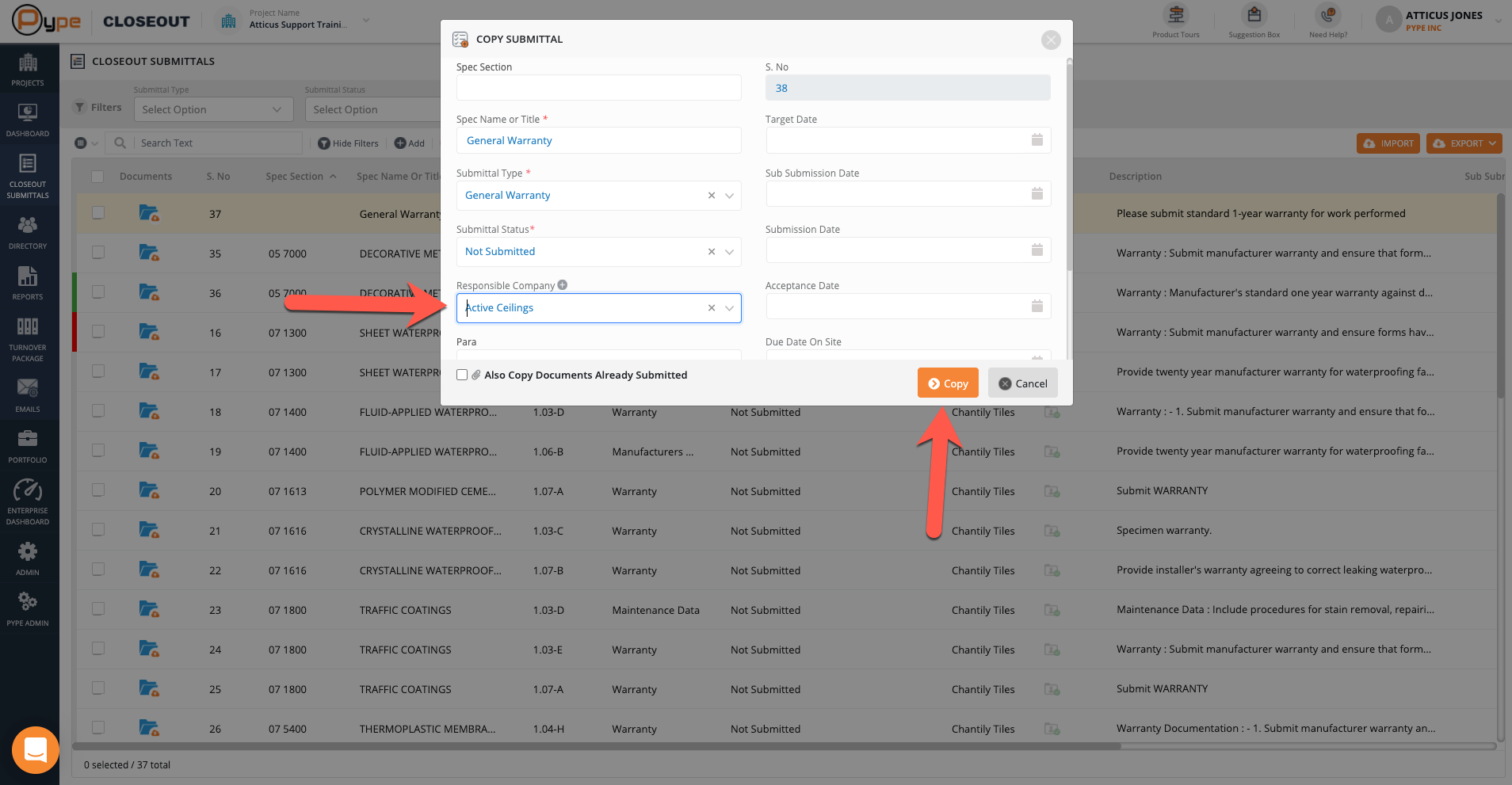 Hover over the submittal you would like to copy, and select Copy on the right.