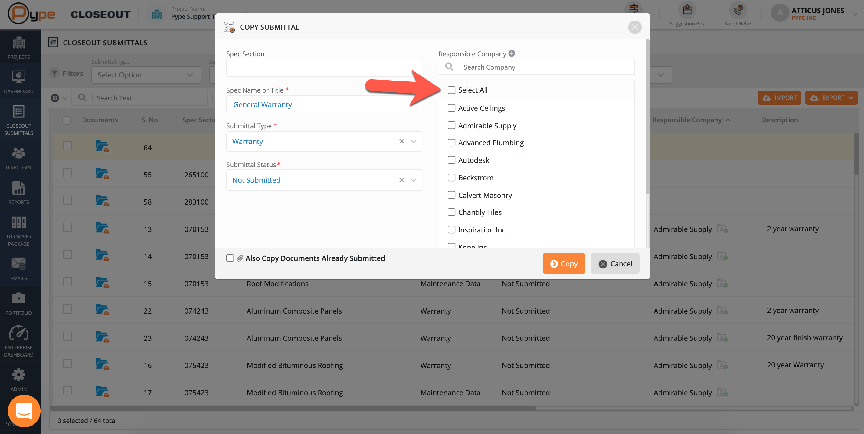 Choose which responsible companies you would like to make a copy of this submittal for. Check the box for Select All to quickly assign this item to all responsible companies in your Directory.