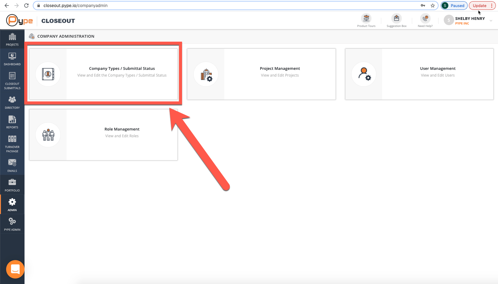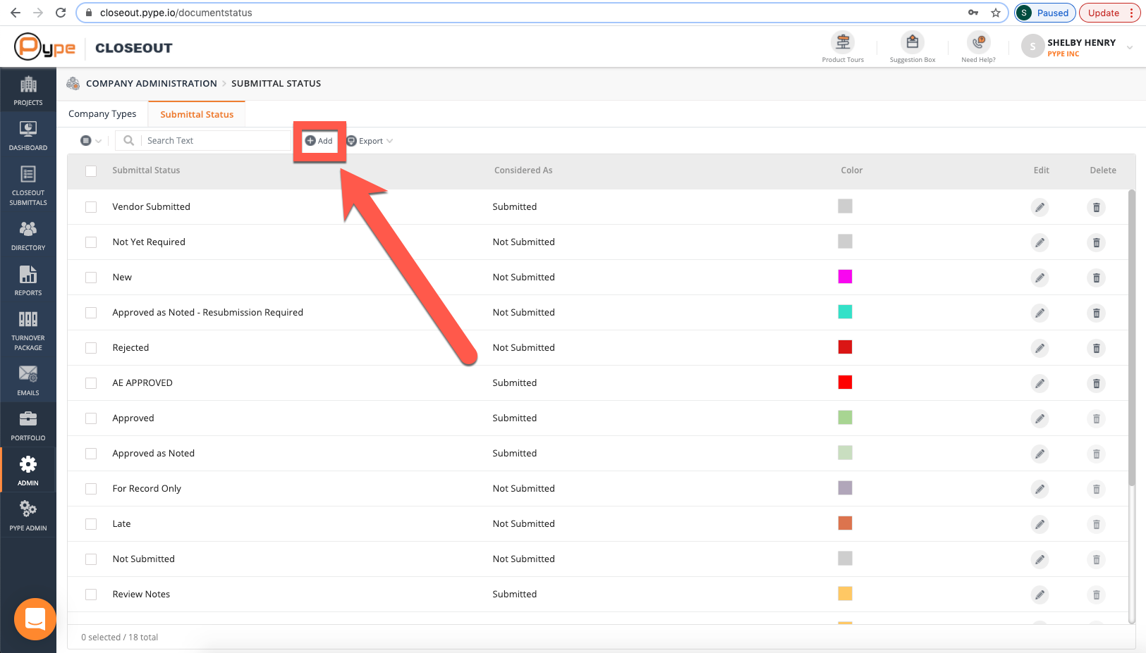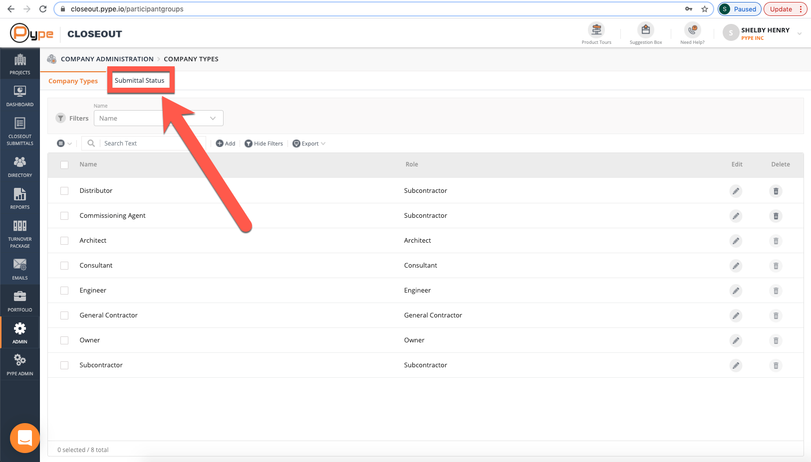 Here, you will select the Submittal Status tab, located next to the Company Types tab.