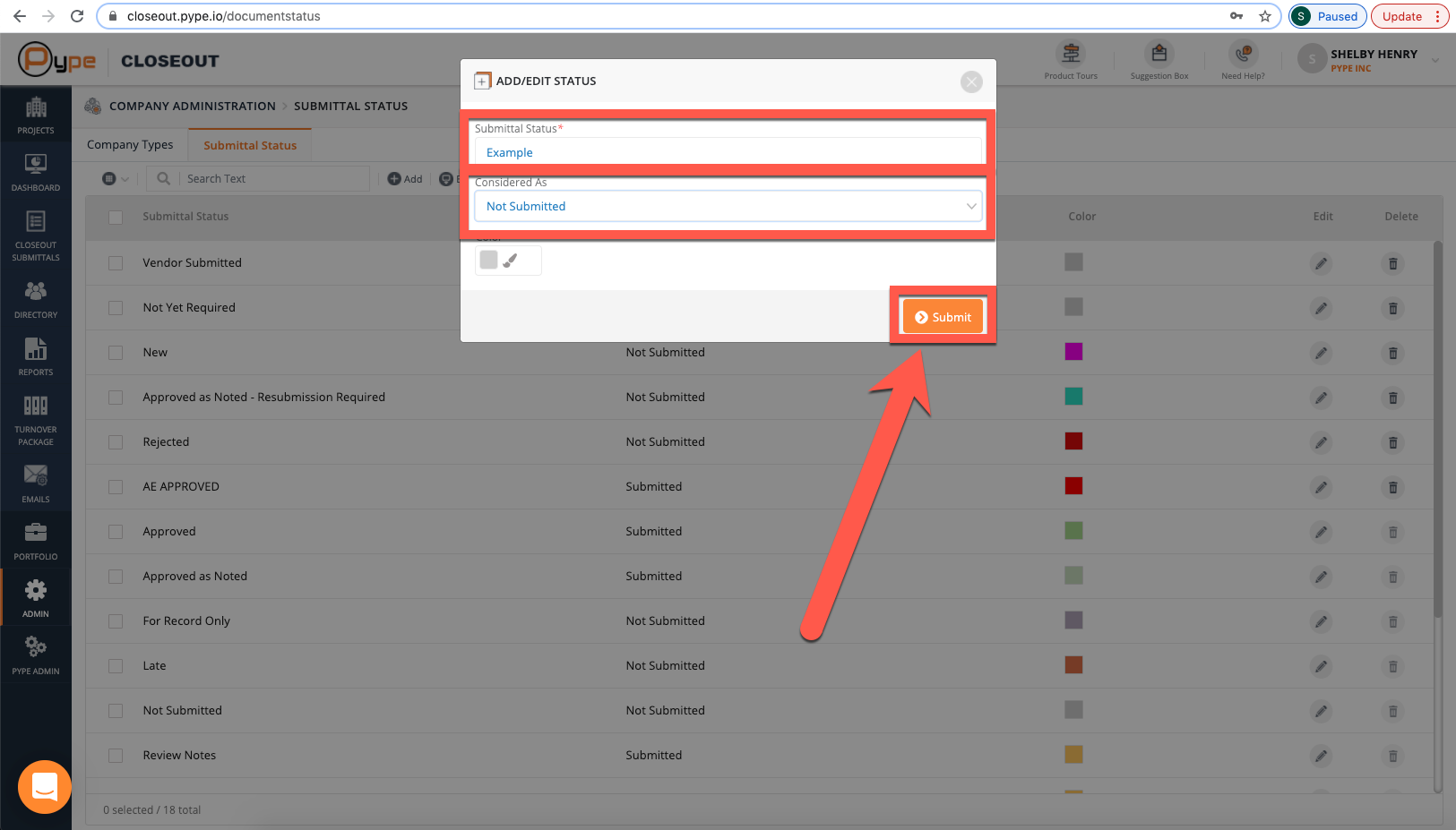 Next, you will need to create a name for your custom submittal status, and then you will need to select whether this status is considered Submitted or Not Submitted. Then, you will select Submit.