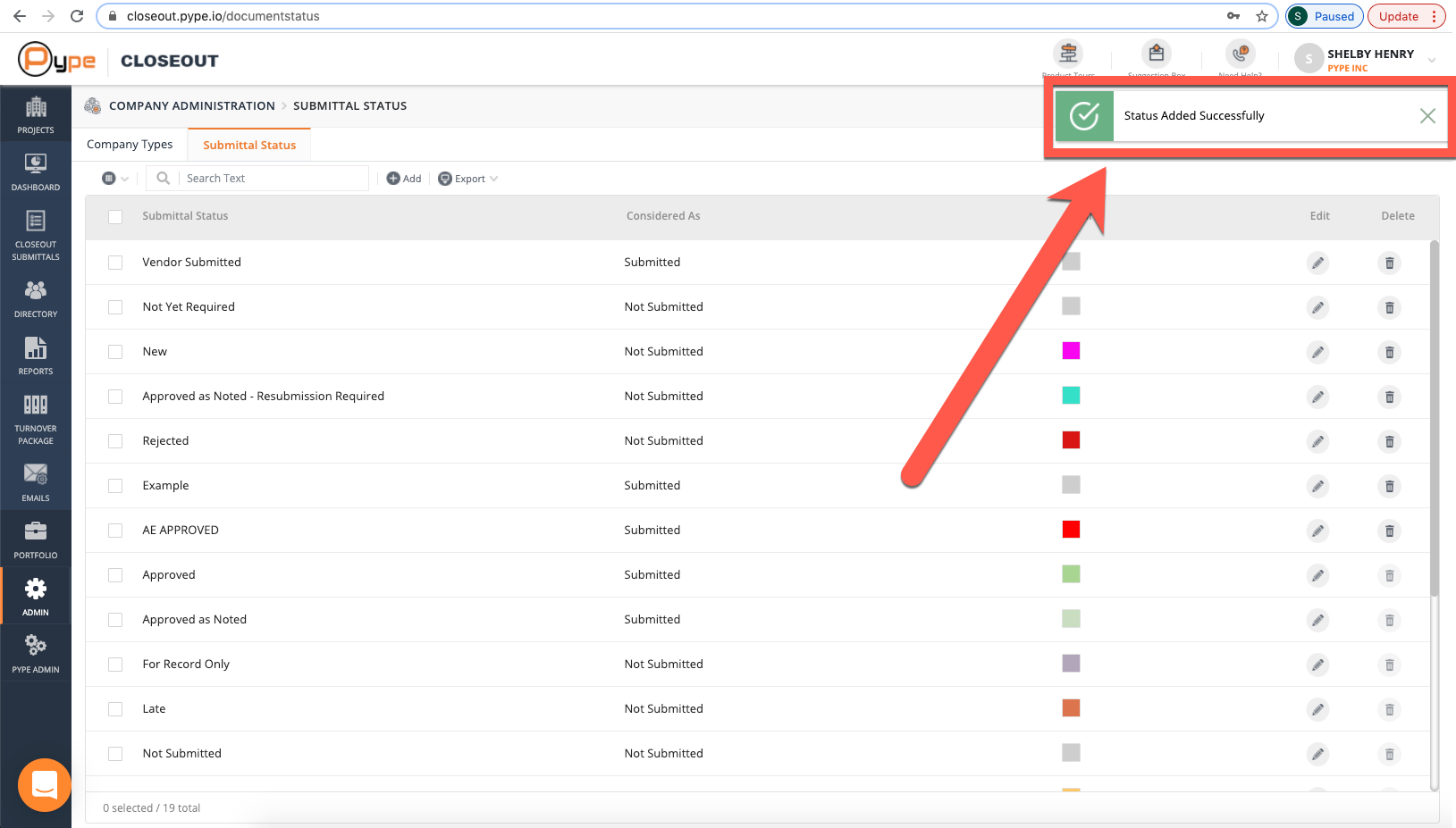 After you select Submit, a notification that says, Status Added Successfully, will appear in the top right corner of the page. You will now be able to assign submittals to this custom status!