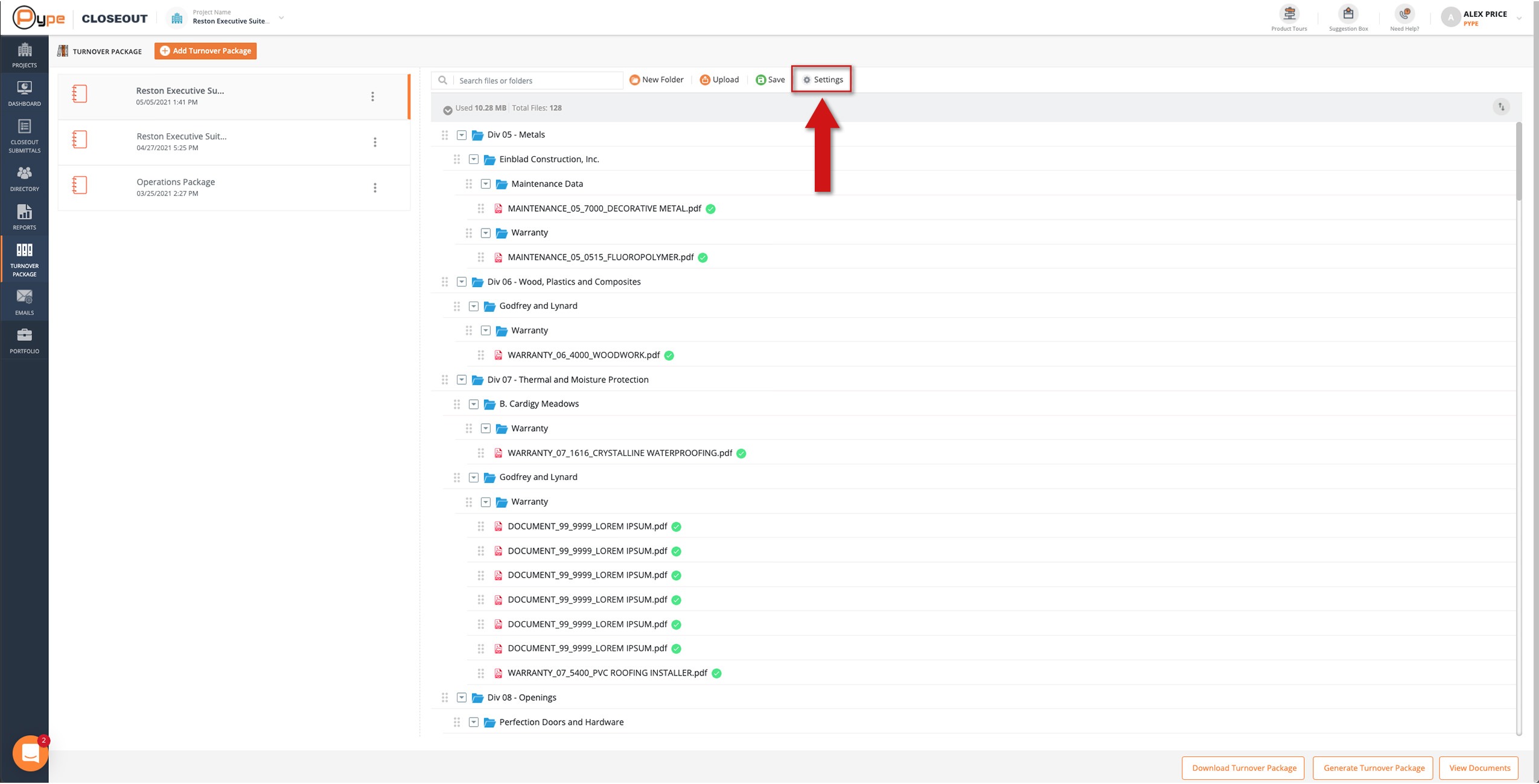 To customize the design of the cover page, table of contents, and/or slip sheets of a created turnover package, select the package from the left and then select the settings icon.