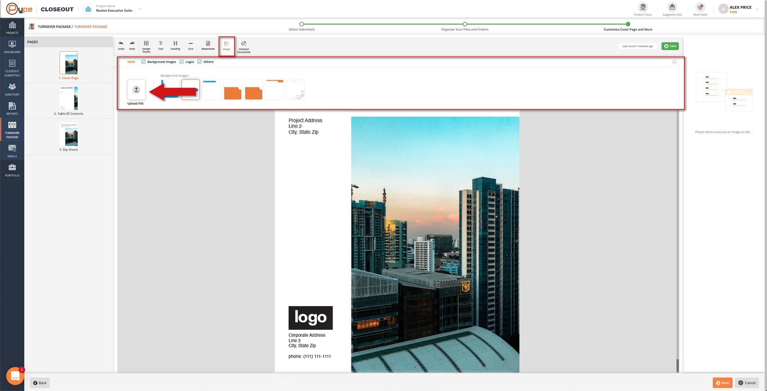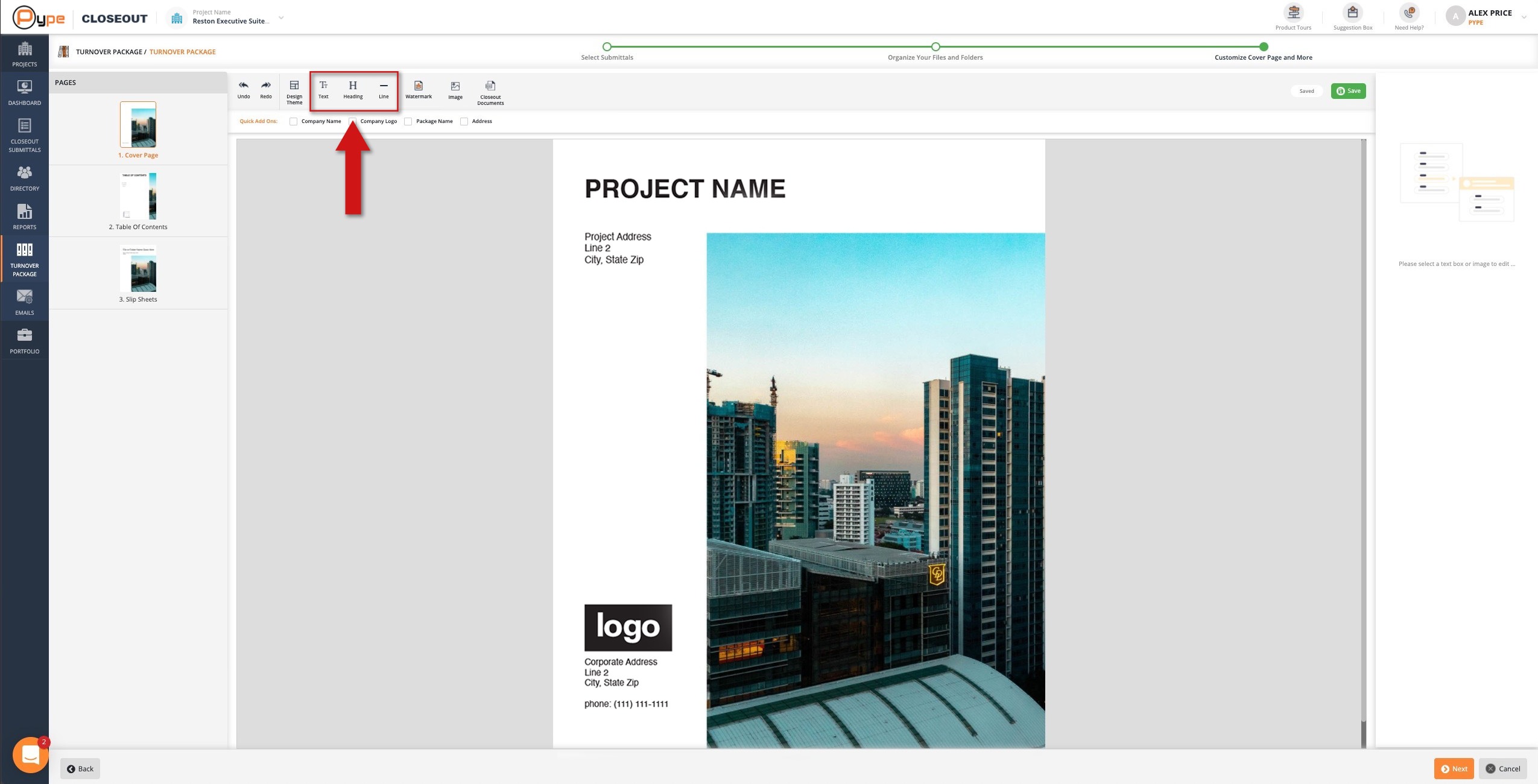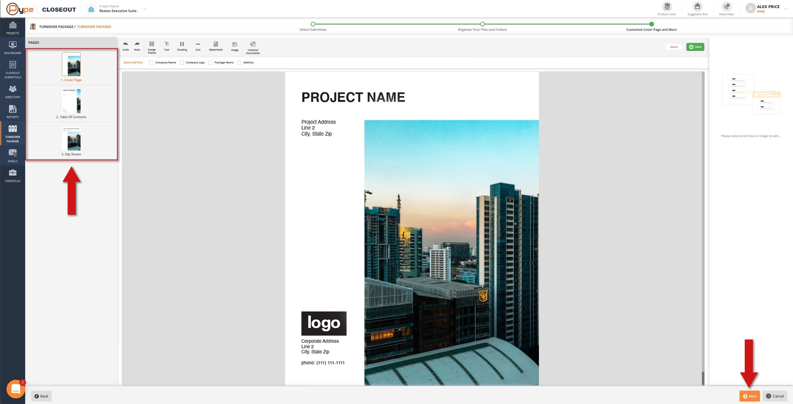 The Cover Page is a preview of what your package's cover page will look like when exported. Use the tools in the toolbar and on the right to customize this page.