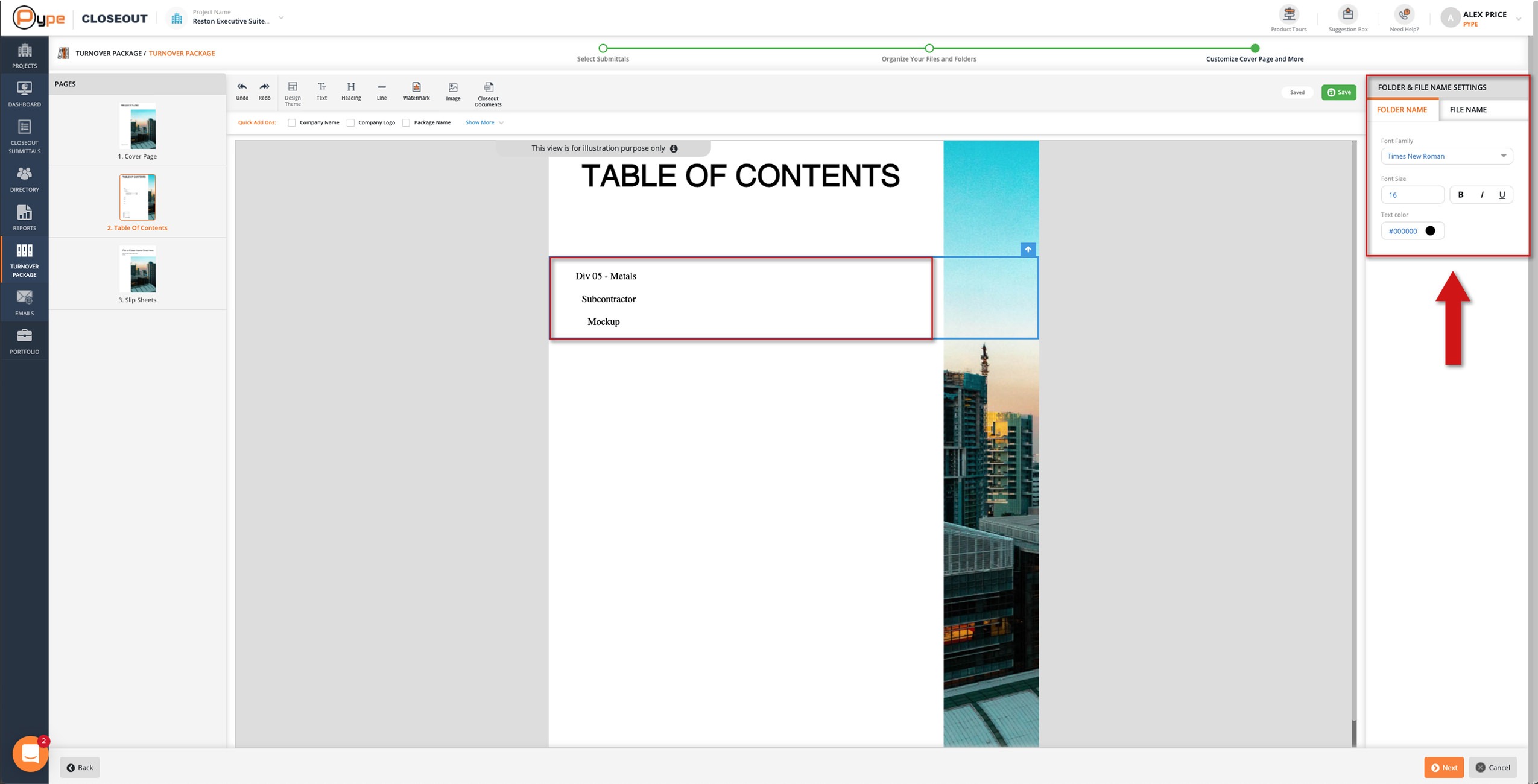 The Table of Contents page is a sample with placeholder names and is a preview of what the full table of contents will look like once your package is generated.