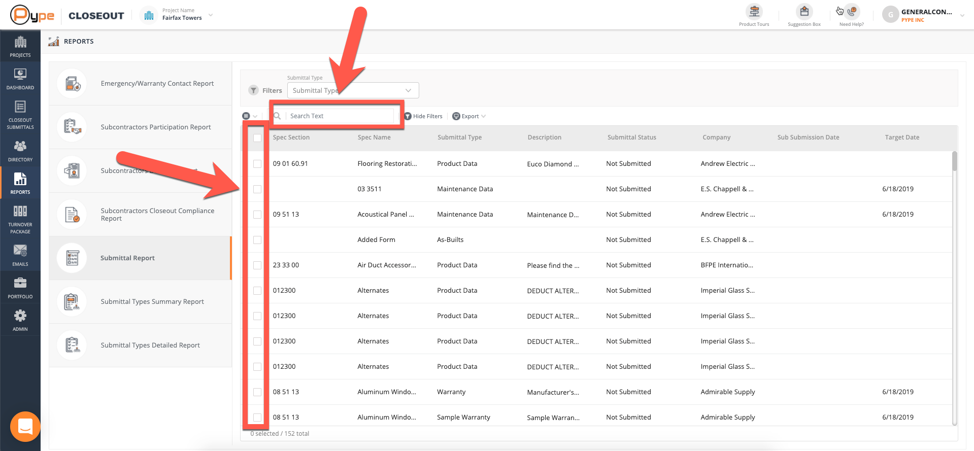 You will want to use the Search Text button to search for certain key words or the filter bars underneath some of the columns in order to filter for only certain subcontractors, items, etc. You can also choose to select some or all of the records by clicking the check boxes to the left.