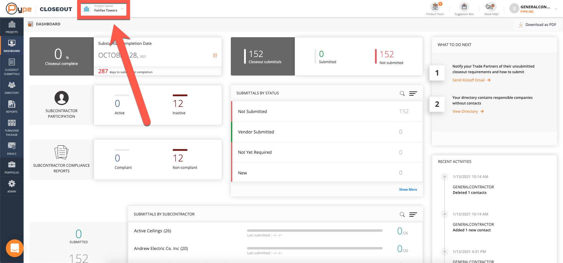 Once you select the desired project, you will be directed to that project's Dashboard. You will know you are in the correct project because the Project Name will be listed at the top of the page. You can easily switch between projects here as well.