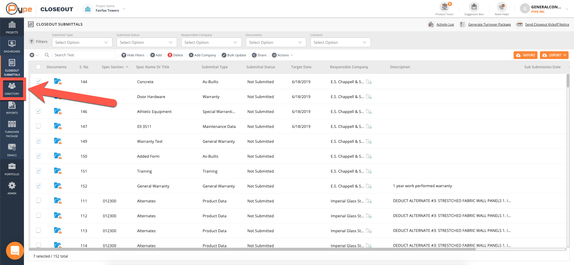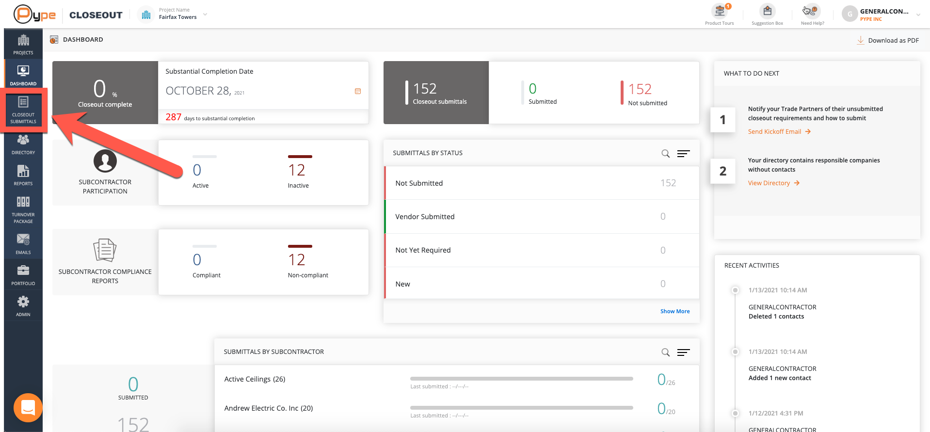 Next, click on the Closeout Submittals icon located on the left-hand side of the page.