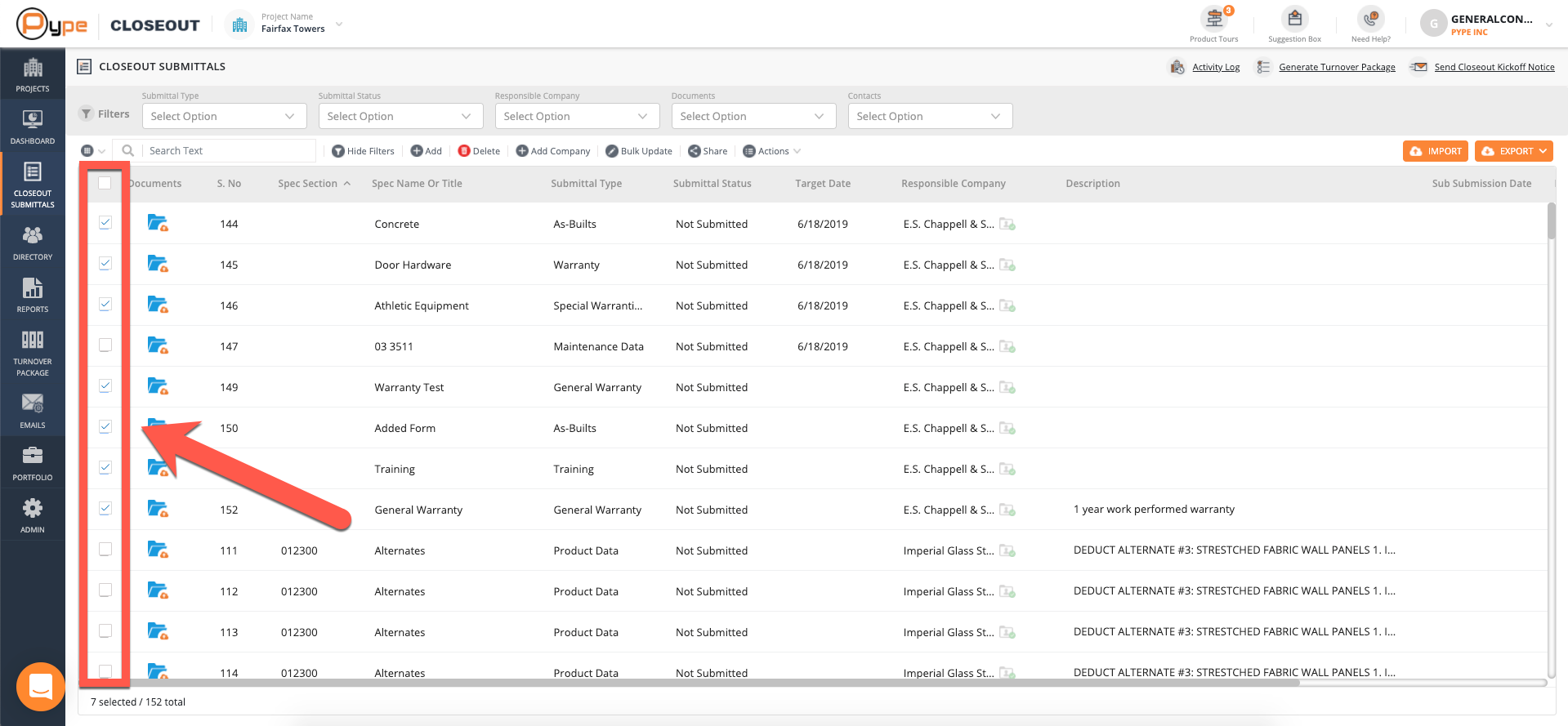 You will see a list of all the submittals for your project, based on your current filters. Choose some or all of the submittals that you would like to export by checking the boxes.