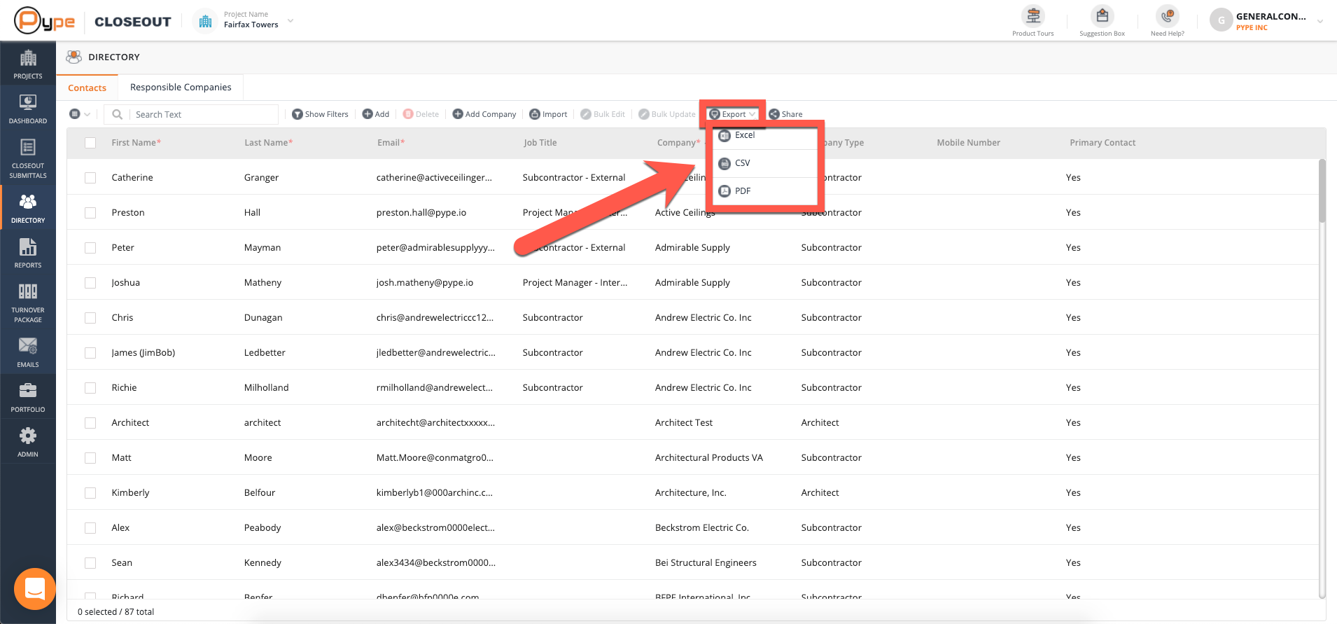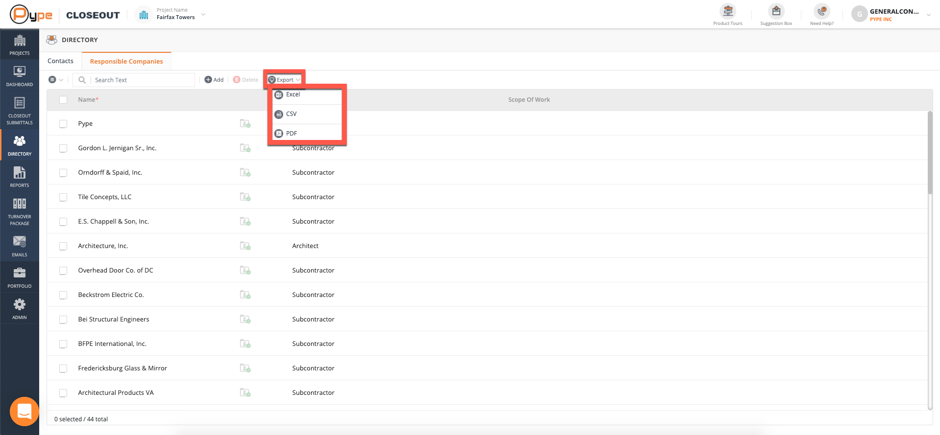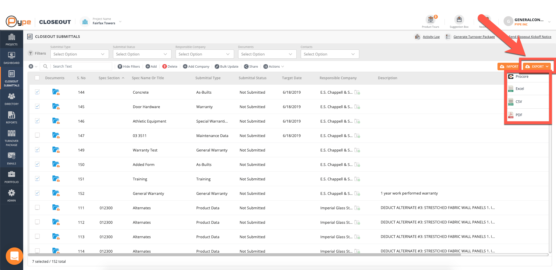 You have the ability to export submittals, contacts, and companies into excel, csv, or PDFs. Let’s start with exporting submittals before we move onto exporting contacts and companies.