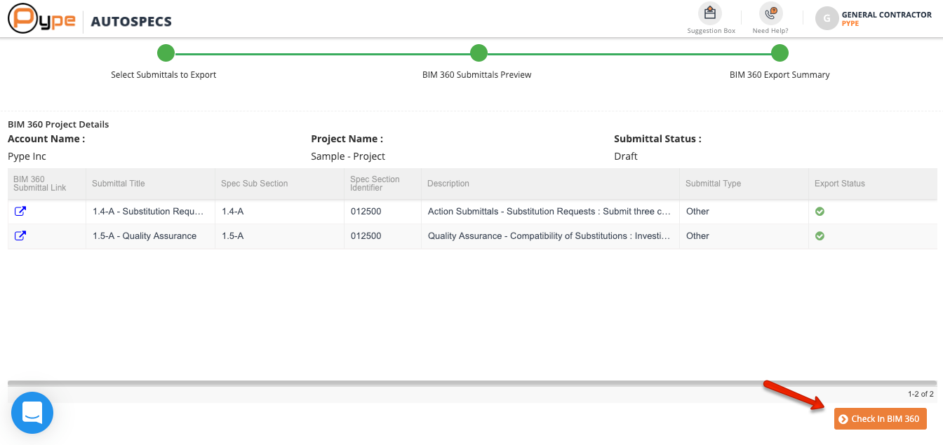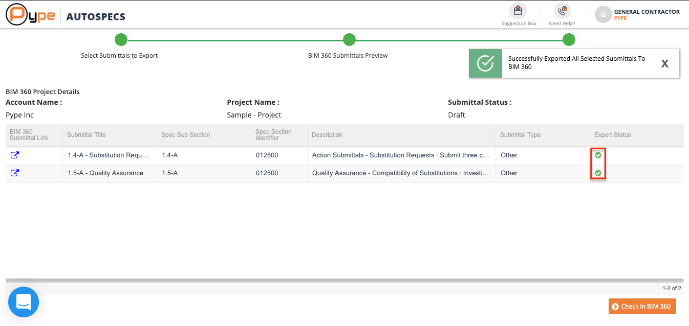 View all the exported submittals in BIM 360. Click on 'Check in BIM 360' if you want to see all the exported submittals in BIM 360.