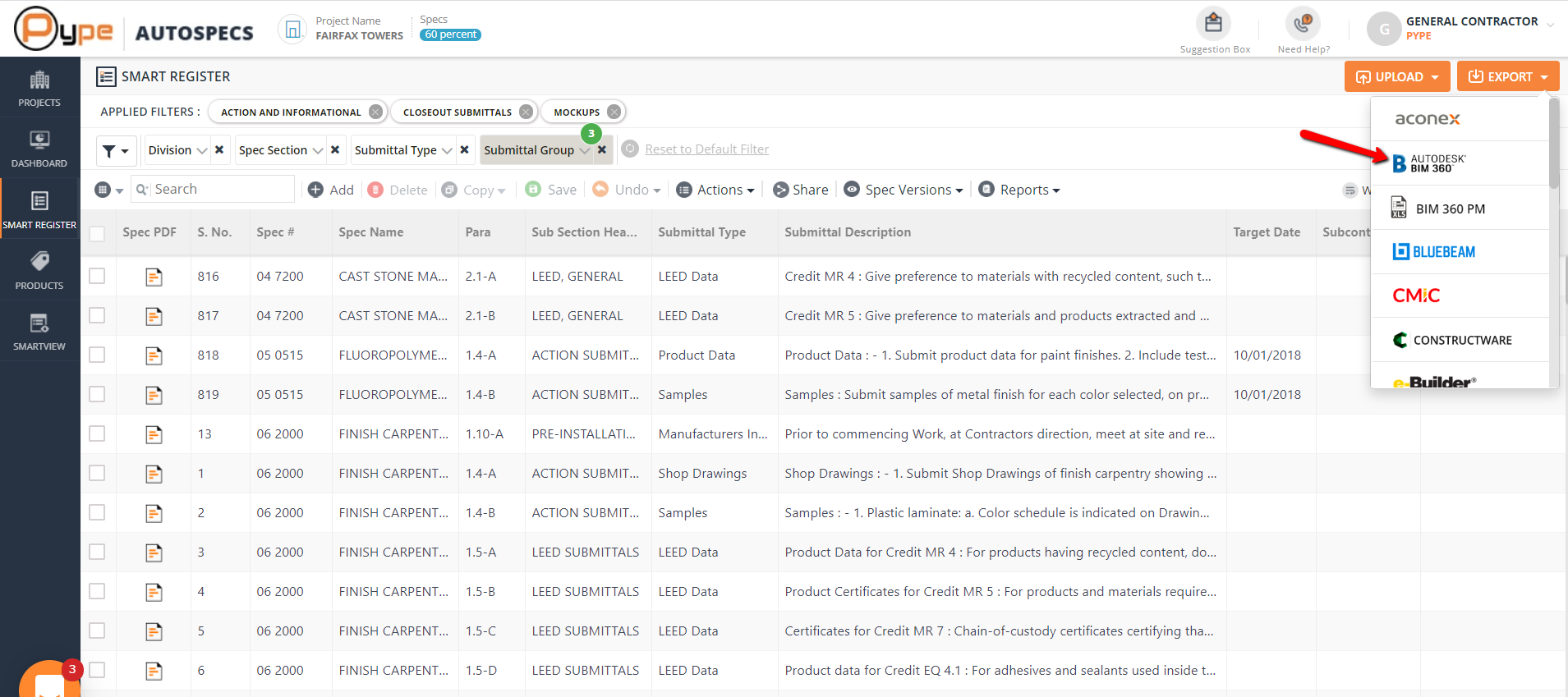 Once you've reviewed all of your submittals and are ready to export, click on 'Export' and select the 'BIM 360' option.