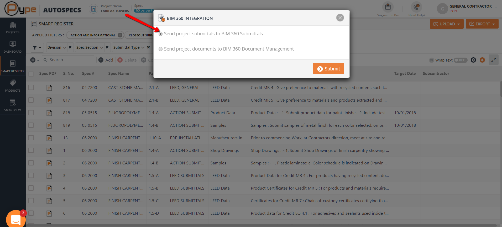 Select BIM 360 Submittals. Out of the two options shown, select 'Send project submittals to BIM 360 Submittals' and click on 'Submit'.