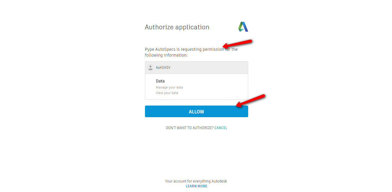 Authorize AutoSpecs access to your account in BIM 360 Submittals. Once you click on submit, you will be redirected to BIM 360. If a BIM 360 login page shows up, login to the account with your username and password. Once successfully logged in, you will be shown a page to authorize AutoSpecs access to your BIM 360 account. Click on "ALLOW".