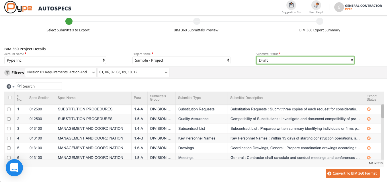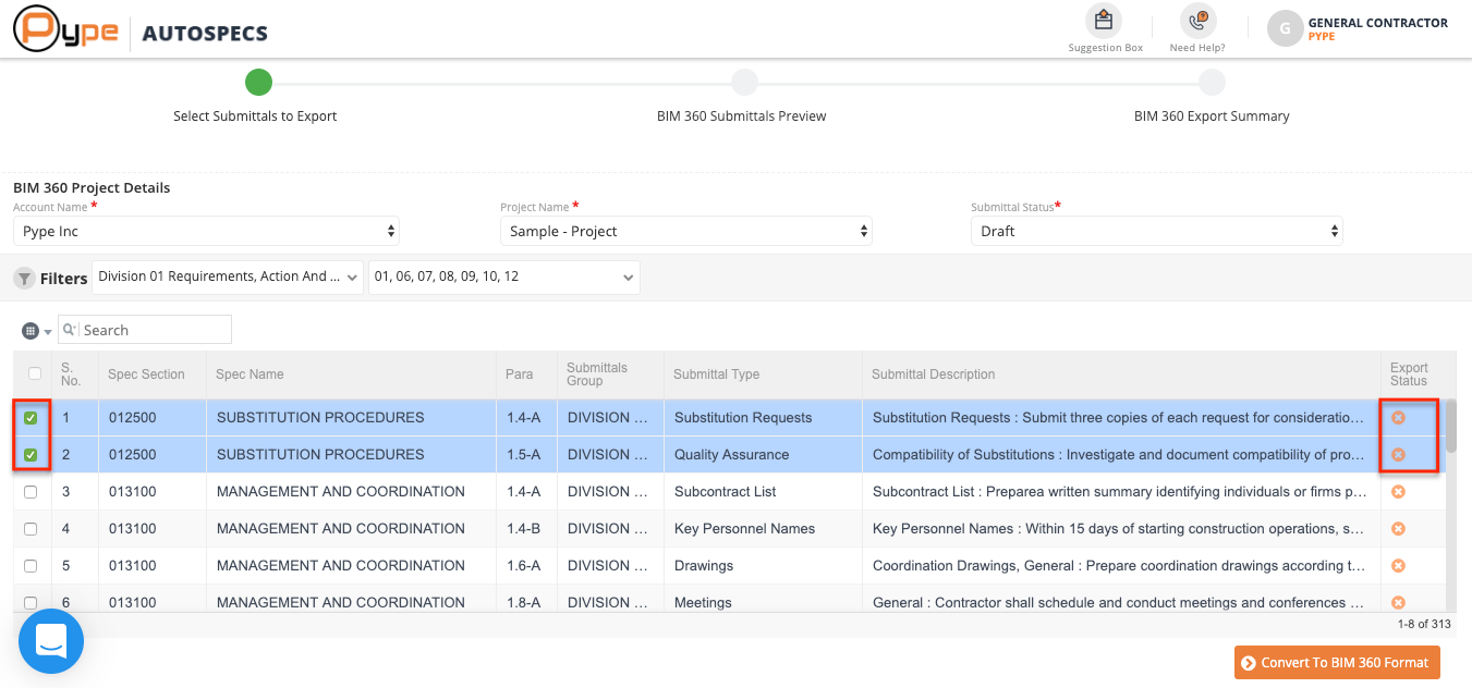 Converting submittals to BIM 360 format. Choose the submittals you want to export to BIM 360 by checking on the respective boxes. You can also select all the submittals by clicking on top left checkbox. Click on 'Convert to BIM 360 Format' to continue.