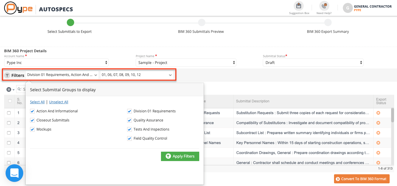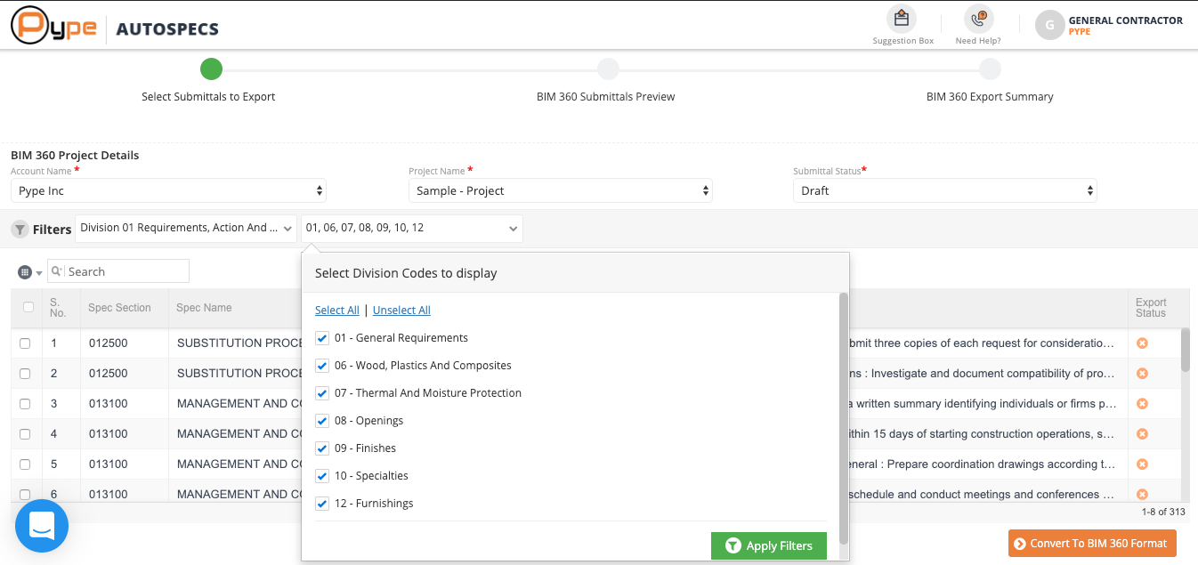Choose the CSI Divisions. Select the CSI Divisions you want to export and click on 'Apply Filters' . You can either go with all CSI Divisions or select specific CSI Divisions to export to BIM 360 Submittals.