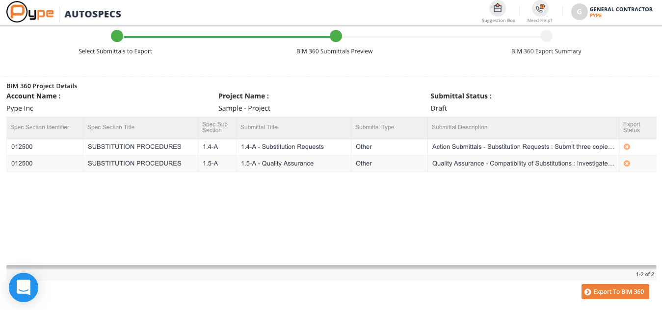 Review and Export submittals. Submittals have been converted from AutoSpecs format to the BIM 360 format. The content you see in this screen is how you would see content in a BIM 360 Submittal.