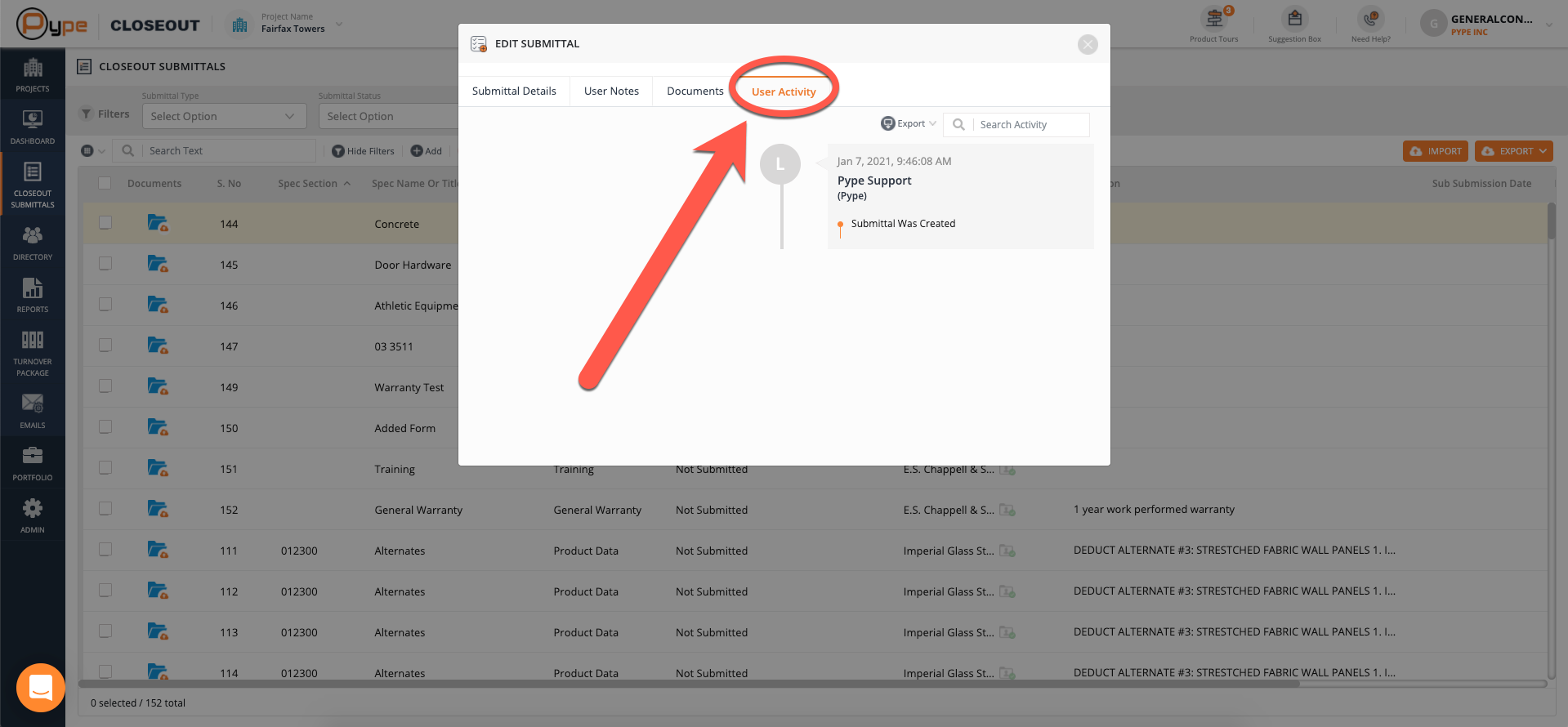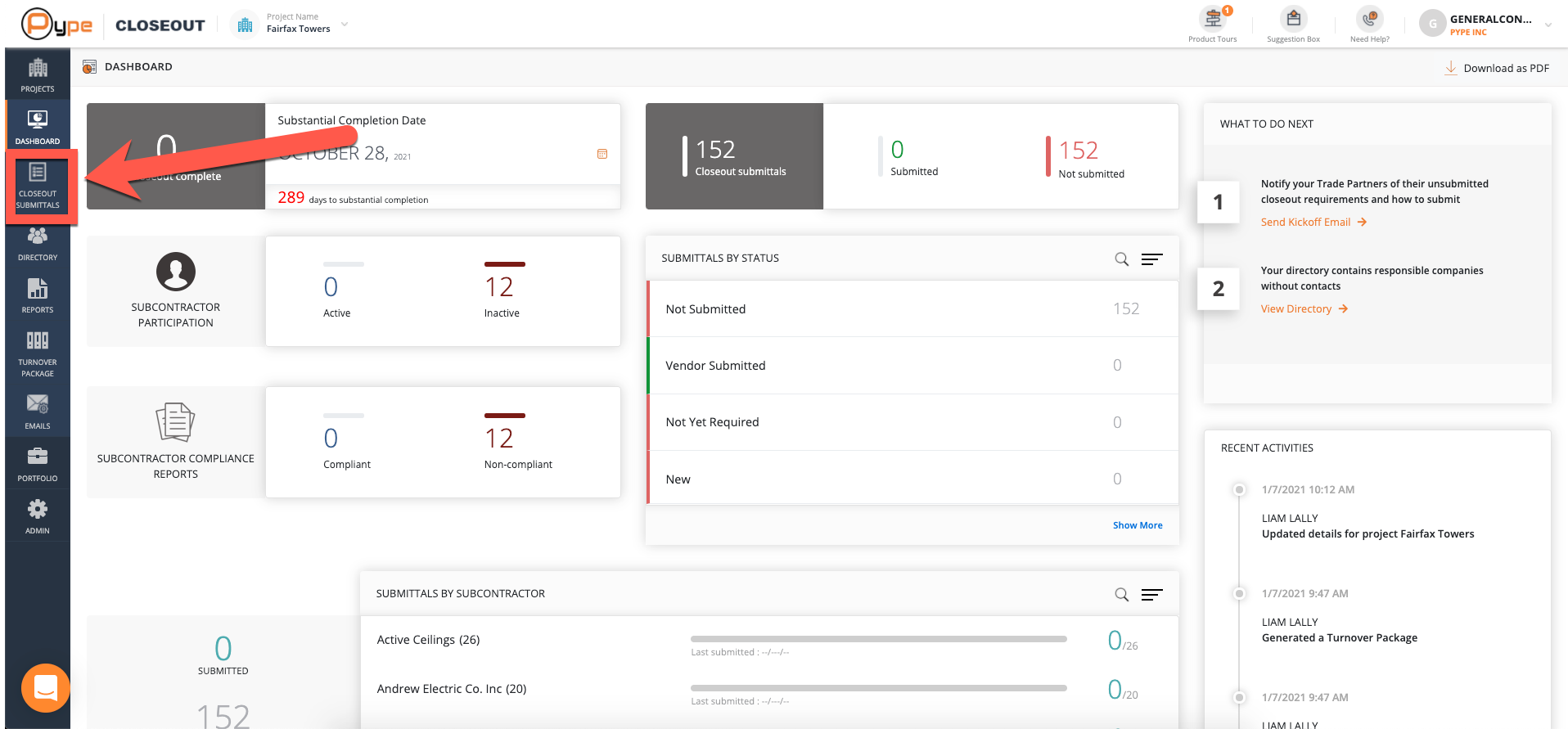 Once you are in the desired project, click on the Closeout Submittals option on the left-hand side of the page to access the submittals for your project.