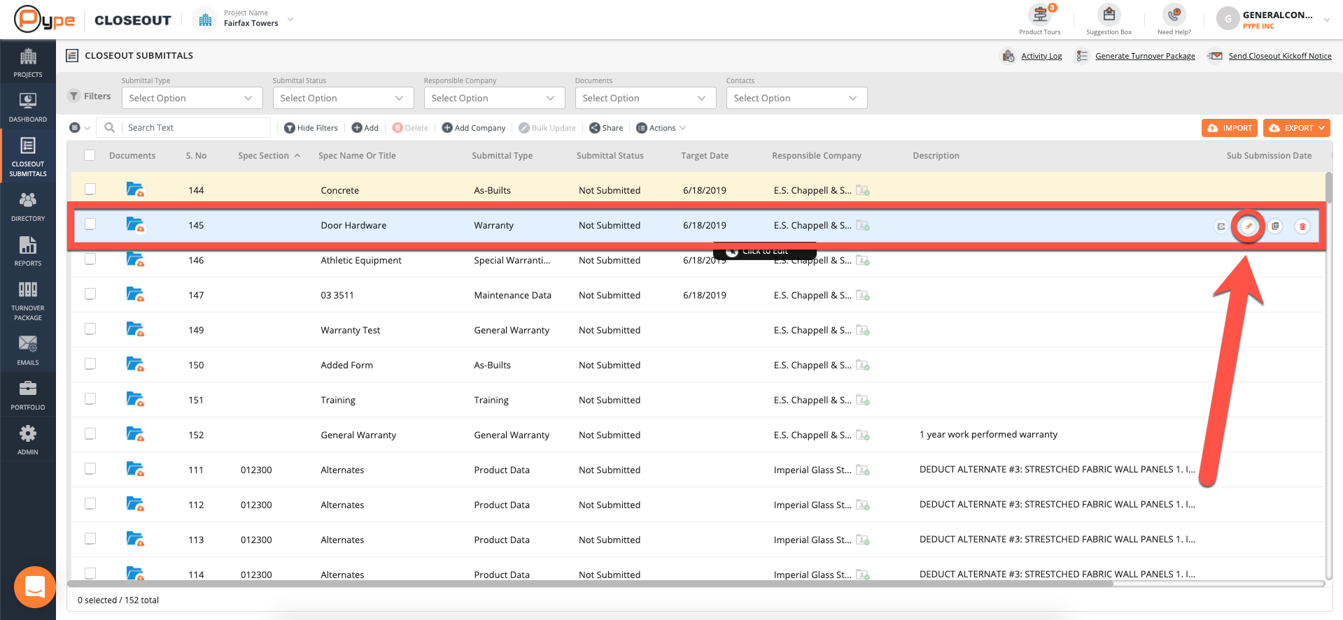 You will see all of the submittals for your project. From here, choose the desired record you’d like to track changes for by hovering over the submittal and clicking the Pencil icon.