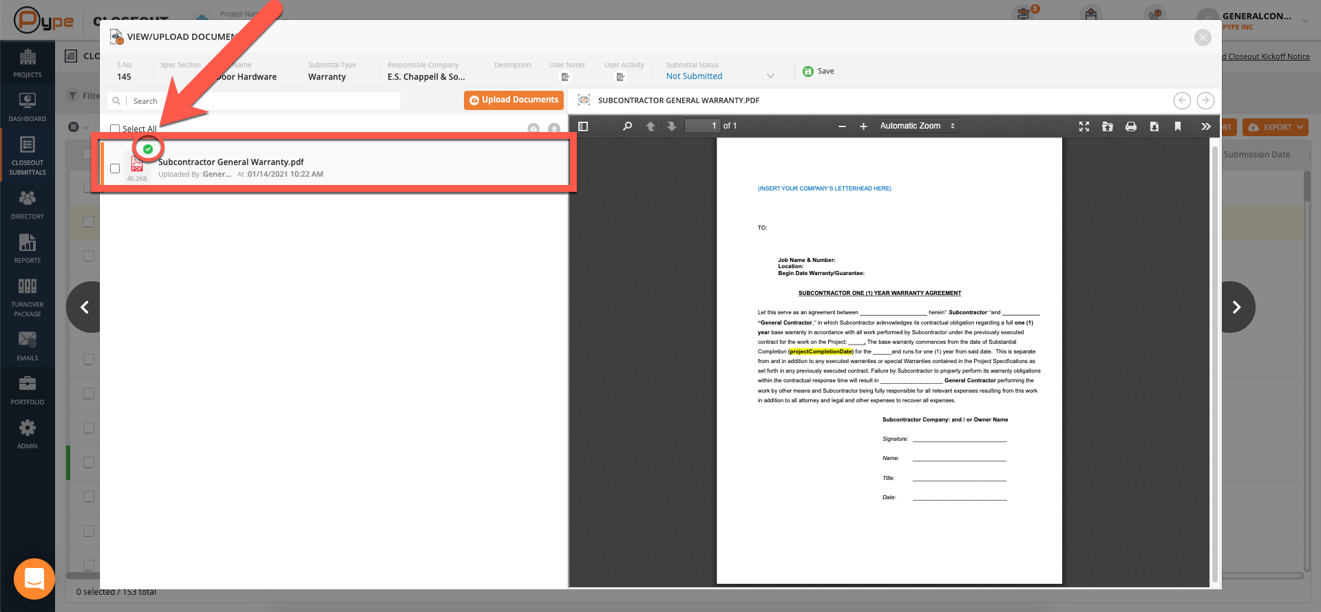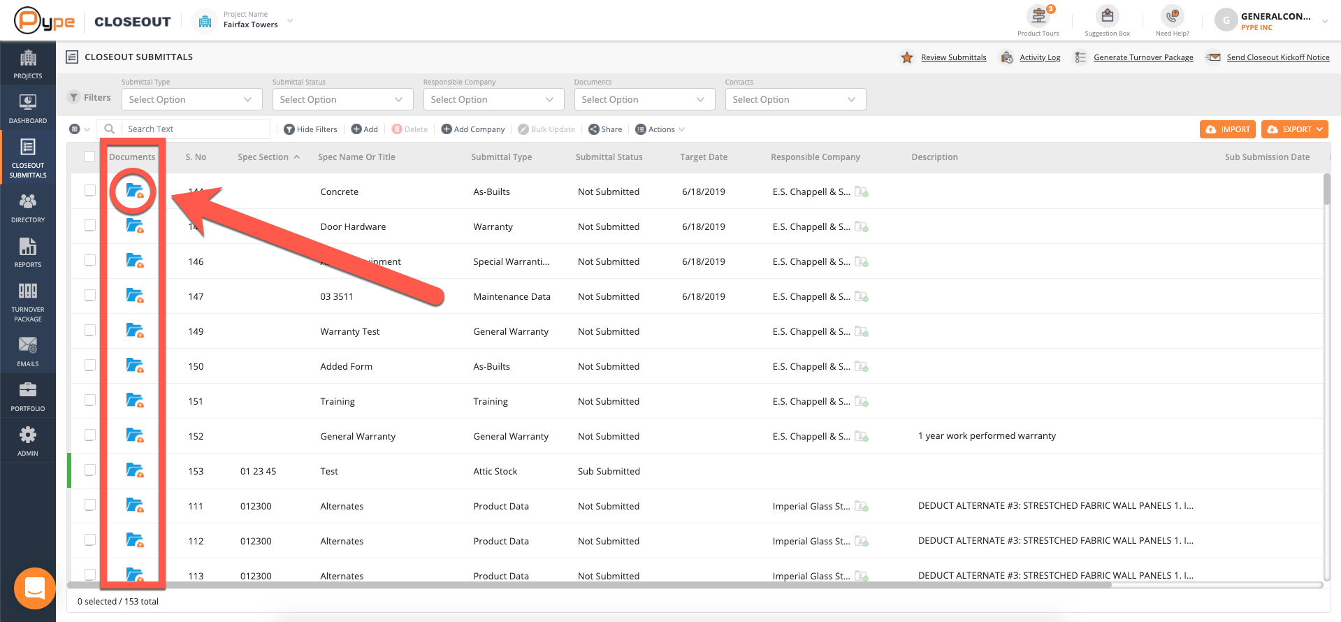 Once you are in the desired project, click on the Closeout Submittals option on the left-hand side of the page to access the submittals for the project.