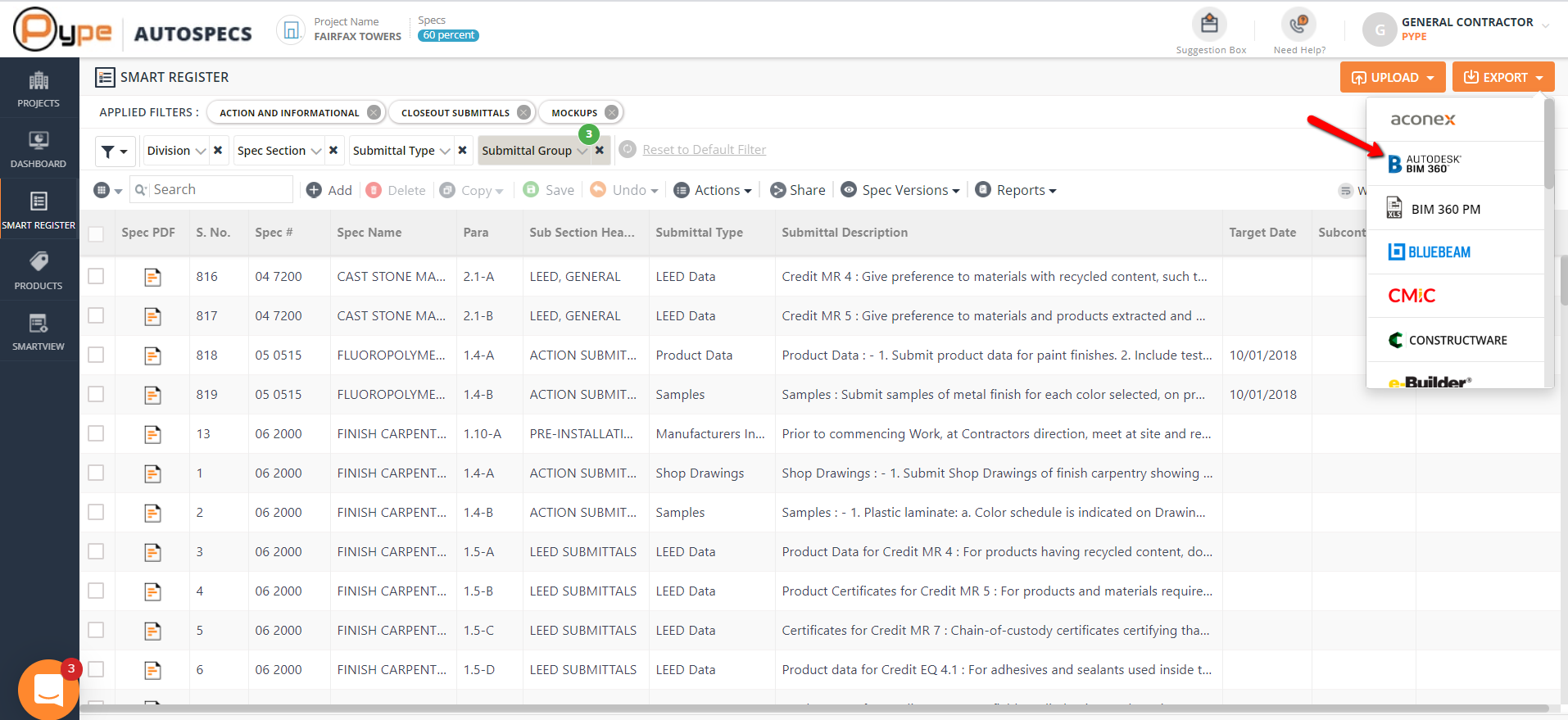 Once your Smart Register is ready, click on 'Export' and select 'BIM 360' option.