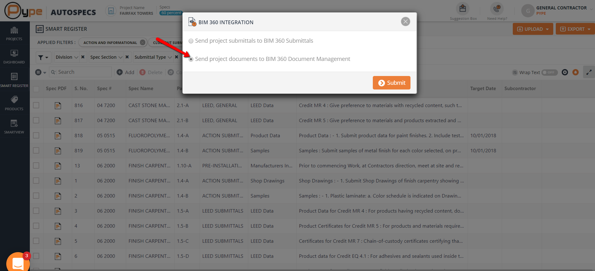 Select BIM 360 documents. Out of the two options, select 'Send project documents to BIM 360 Document Management' and click on 'Submit'.