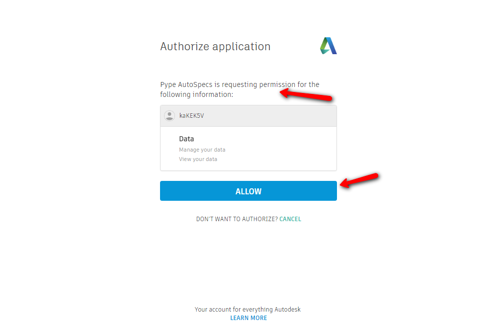 Authorize AutoSpecs access to your account in BIM 360 documents. Once you click on "Submit", you will be redirected to BIM 360 where you can login to your account with your username and password. On successful login, you will be shown a page to authorize AutoSpecs access to your BIM 360 documents in your account. Click "Allow".
