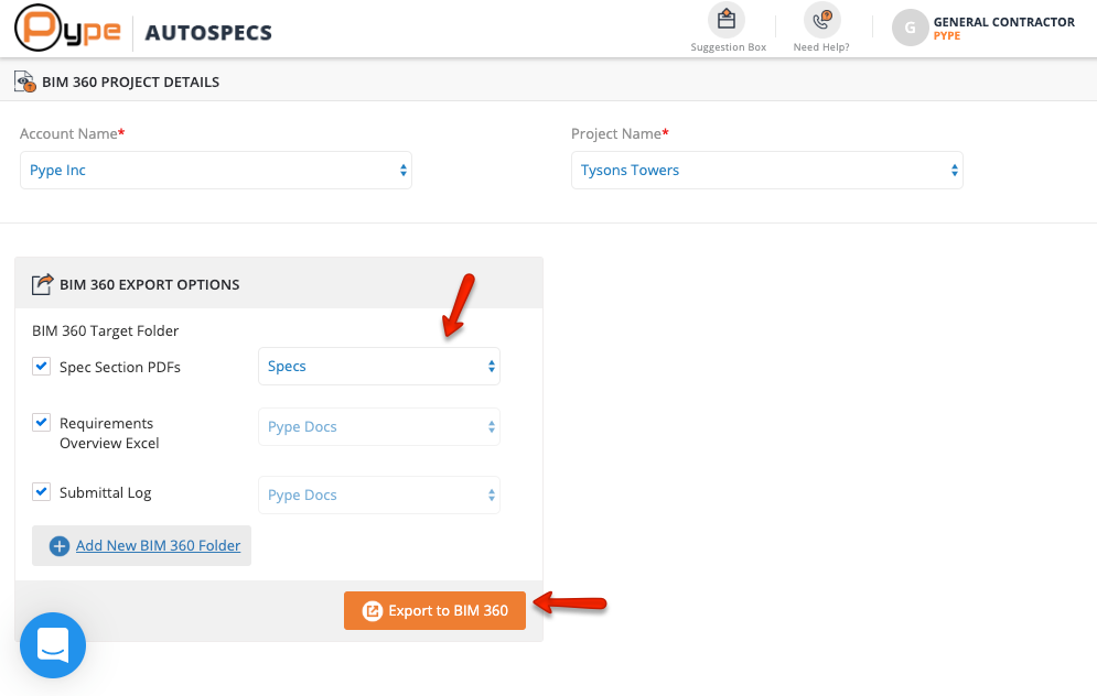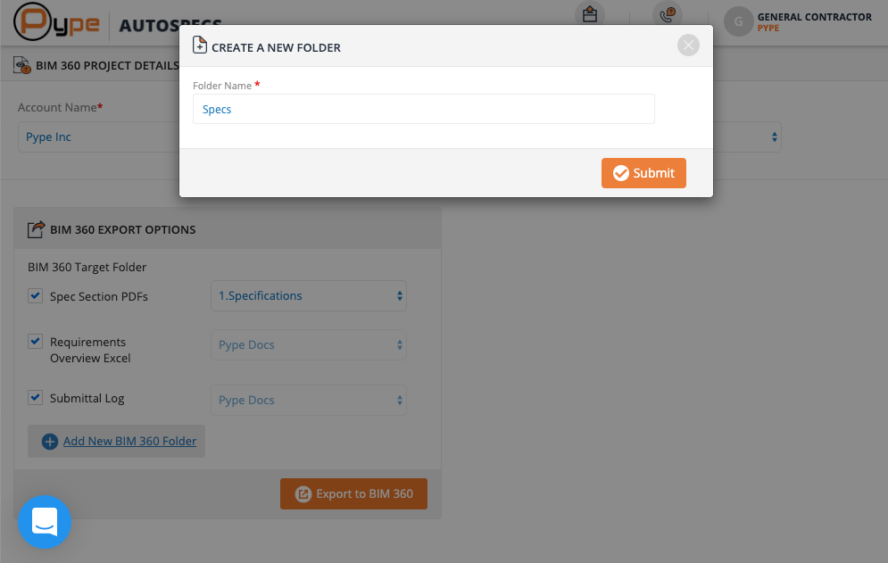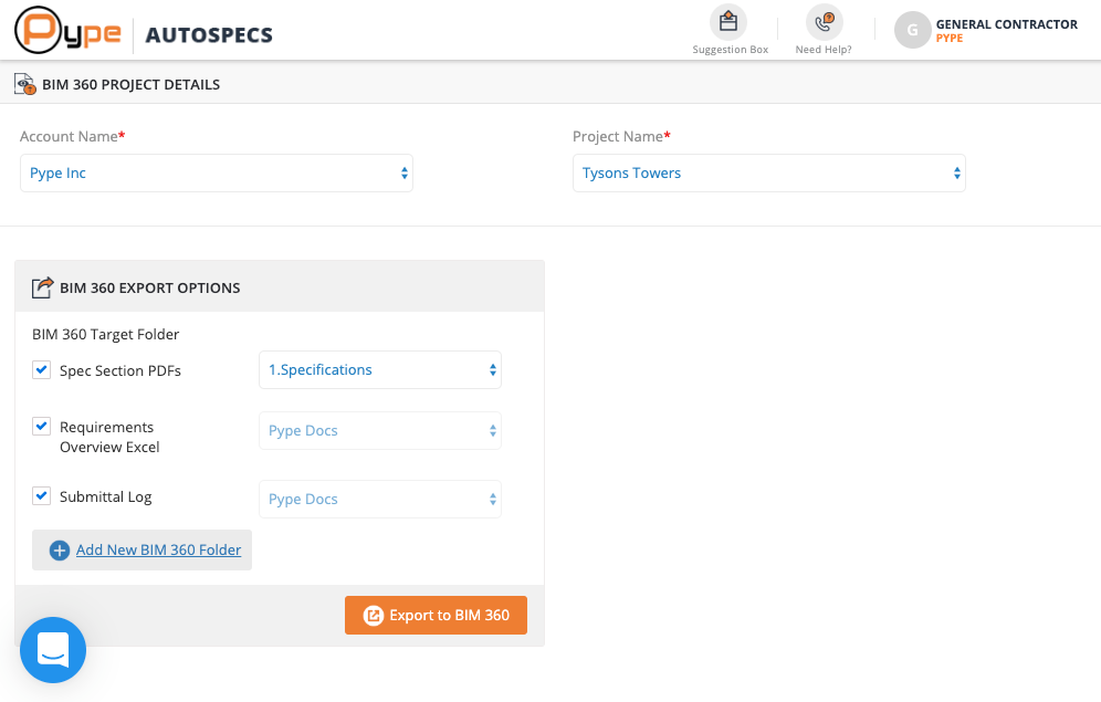 Choose your 'Account Name' and 'Project Name'. Select the folder you want to export to BIM 360. If no folders are present, add new folders by clicking on 'Add New BIM 360 Folder'. Once the folder is created, you can then select that new folder.