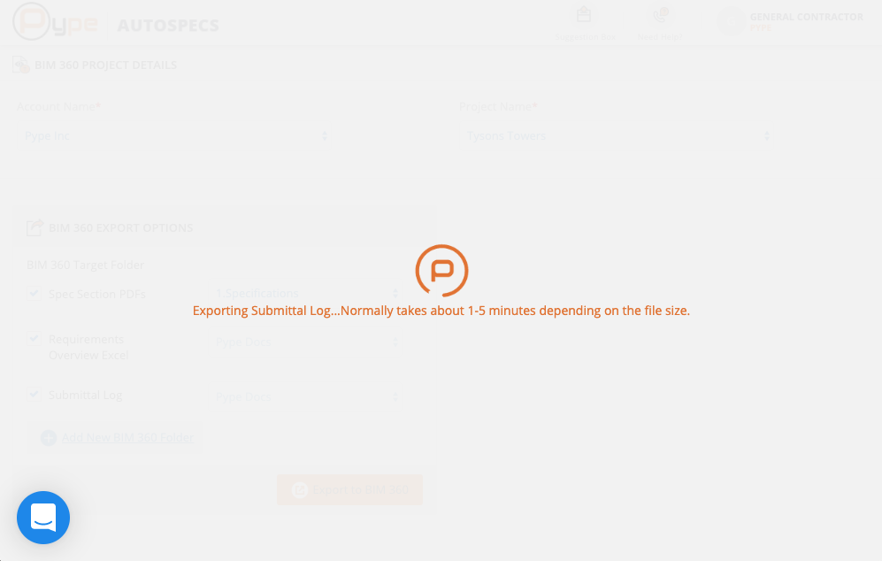 The selected items are being exported into BIM 360.