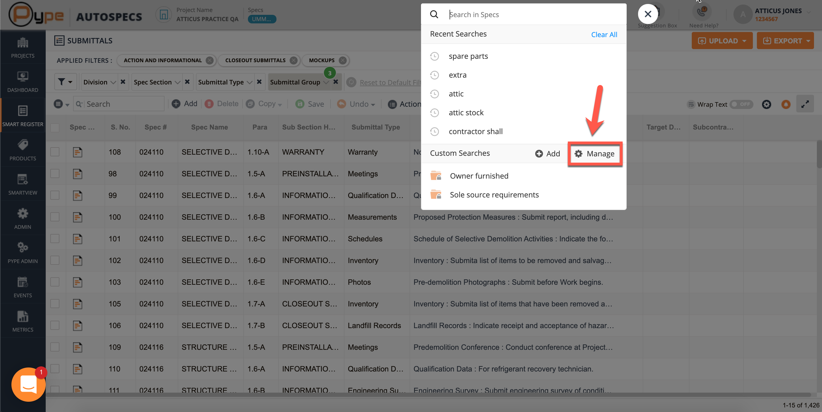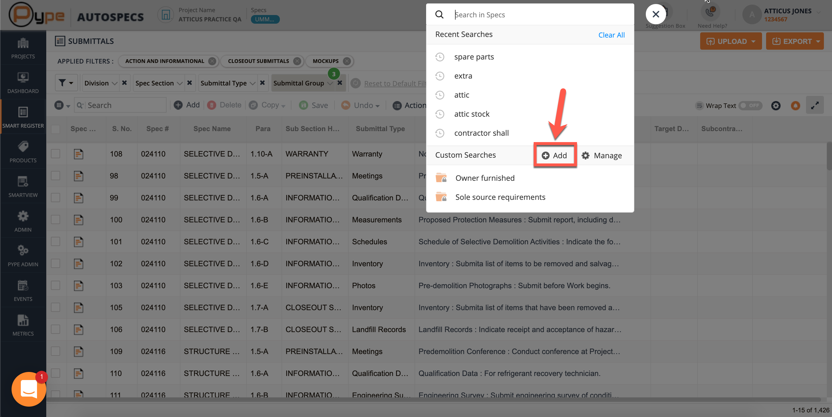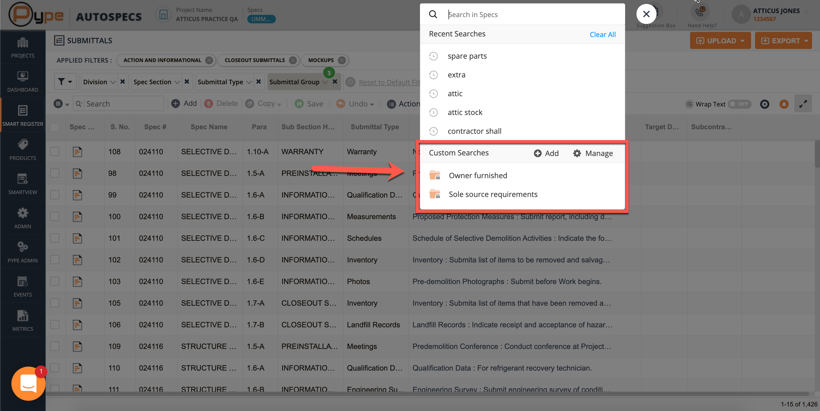 The custom search feature is located within the primary search bar at the top of your page. Custom searches you have created are only visible to you, and carry across your projects so you can use them whenever you need.