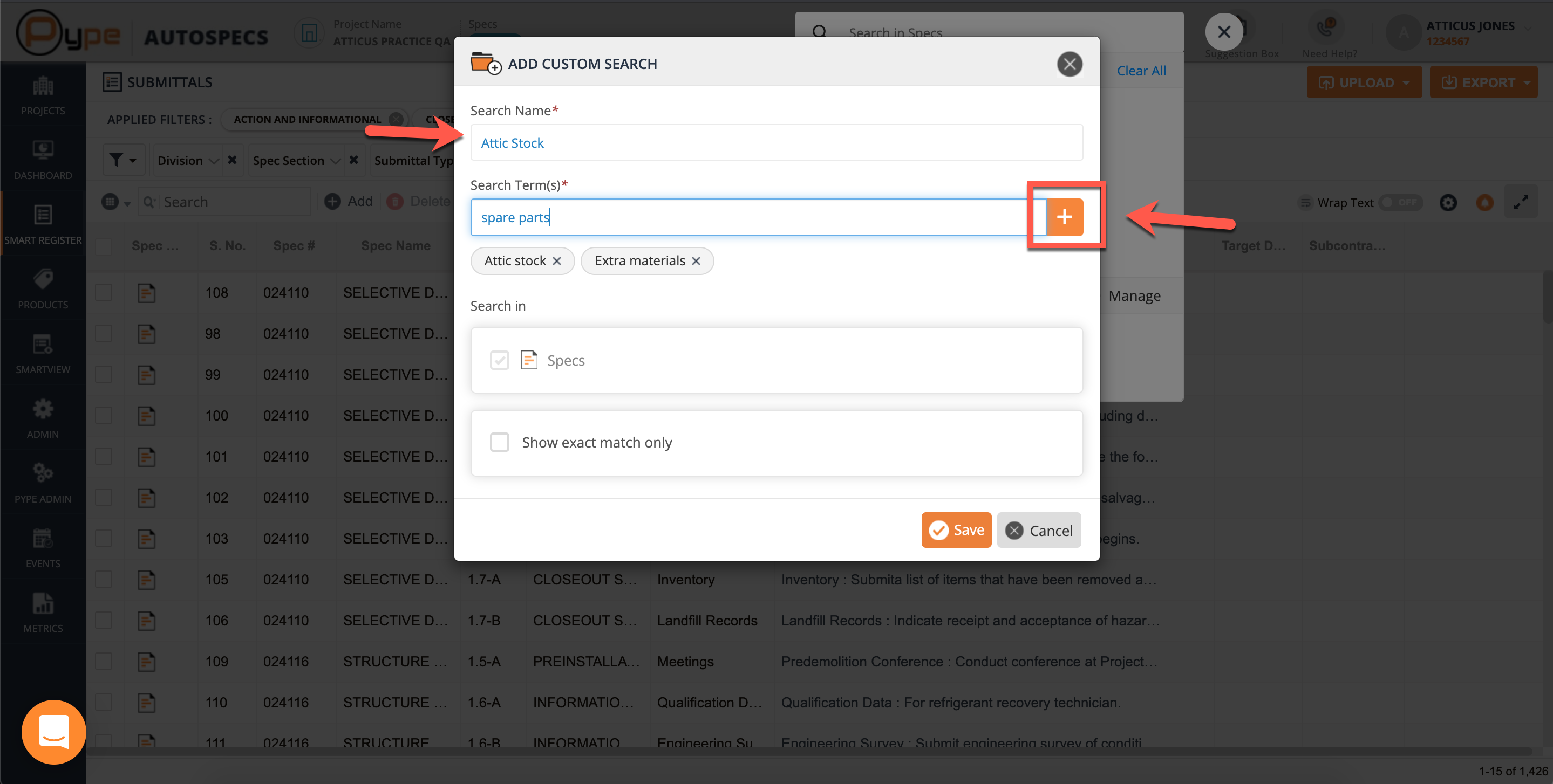 First, give your custom search a title. Next you will need to enter the terms you would like to search for. After typing a term in, select the plus button or enter on your keyboard, and you will see your terms populate the field below. You can remove a term you have entered by clicking the X next to it. We recommend leaving the Show Exact Match Only box unchecked so that variants of your search terms will be included. Once you've entered all the terms you would like in this custom search, select Save.