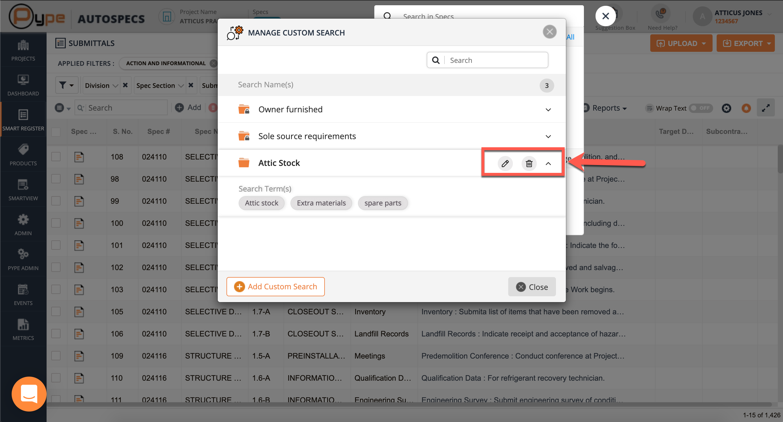 Hover over the item and select the Pencil icon to edit the custom search. Select the Trash Icon to delete it. You can also click the down arrow to view what search terms are included in the custom search.