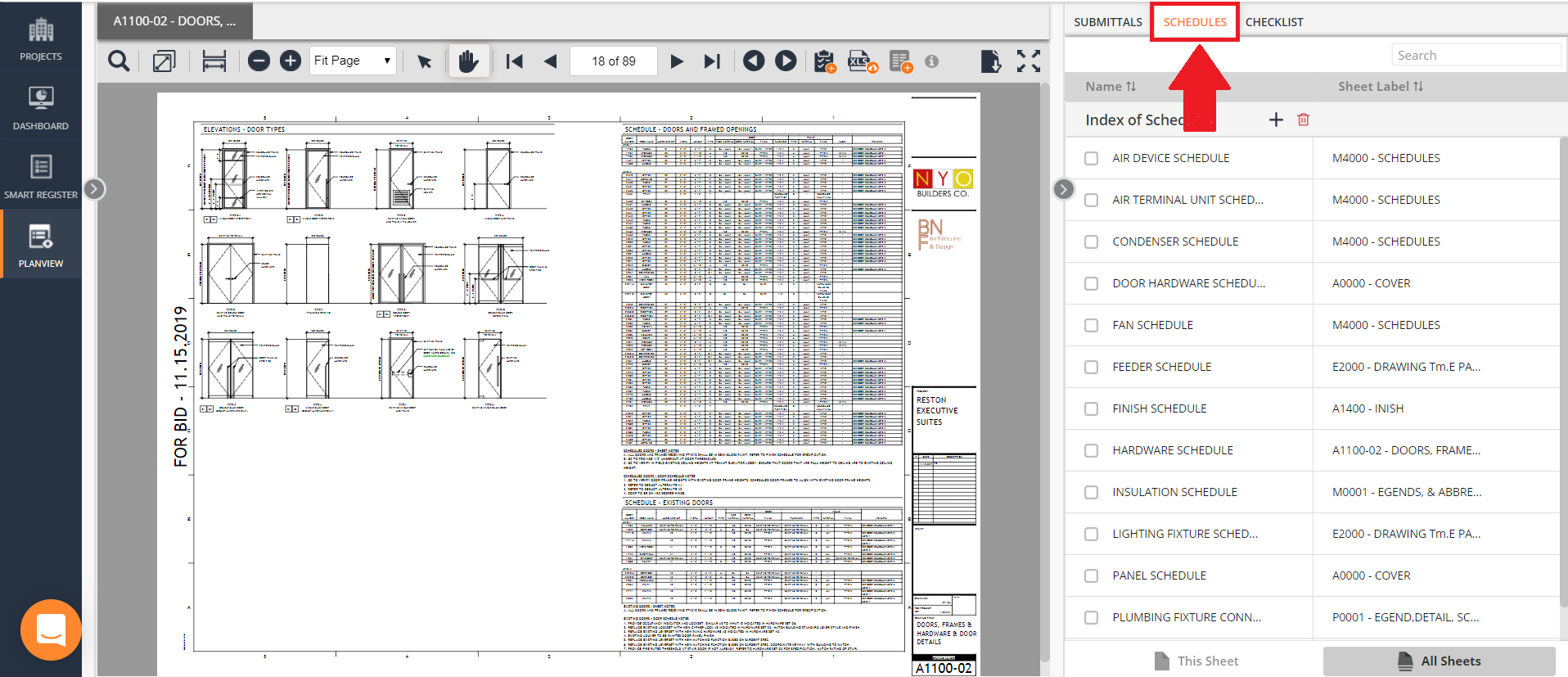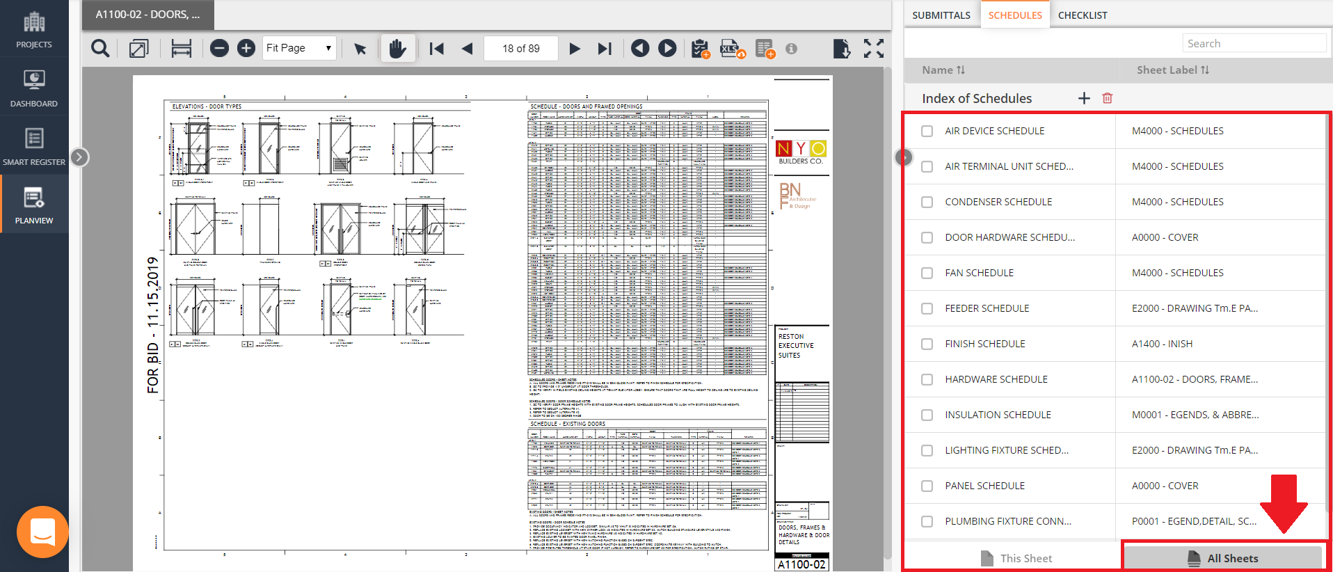 After selecting the "Schedules" tab, a list of the schedules located for the selected sheet will be displayed. If you would like to view all of the schedules located in the entire drawing set, select the "All Submittals" button to the far upper right-hand side. This is highlighted with the red arrow below.