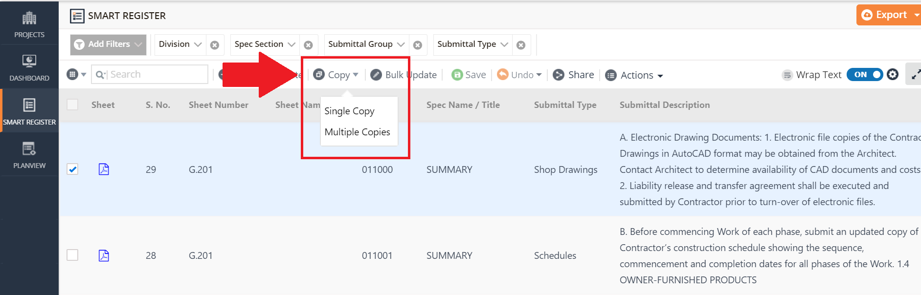 Step 1: In Smart Register select the checkbox next to the submittal(s) you would like to copy.