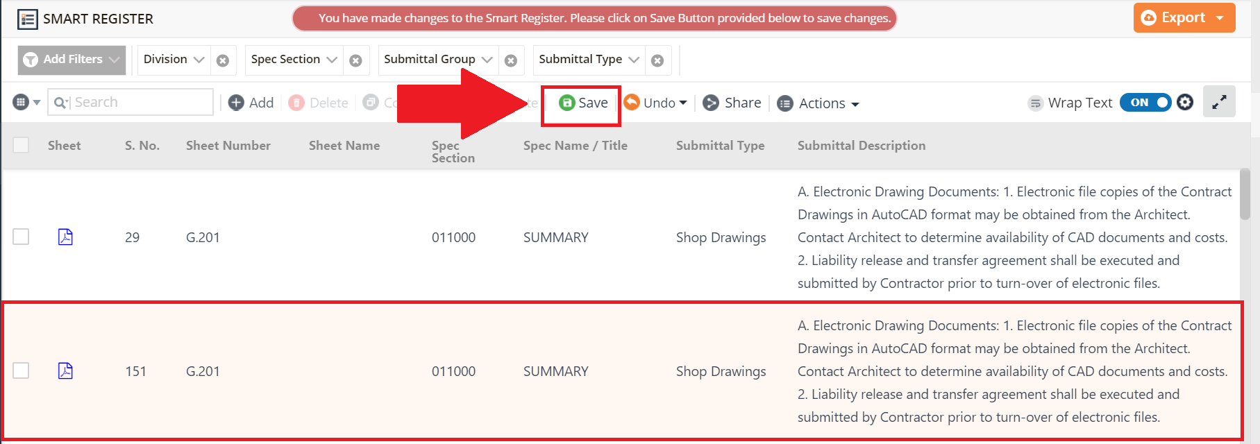 Step 3: Once you copied the selected record(s), the copy will be highlighted in the SmartRegister. From here you can edit the information contained in the description, submittal type, and the other available columns. When complete, make sure to click the "Save" button in order to save the copy and any changes made.